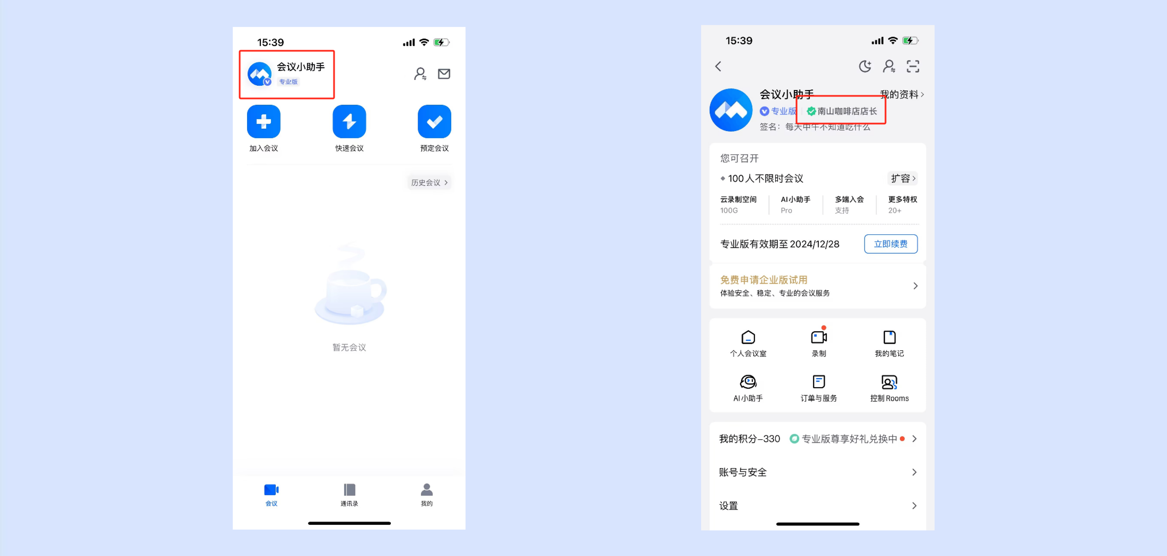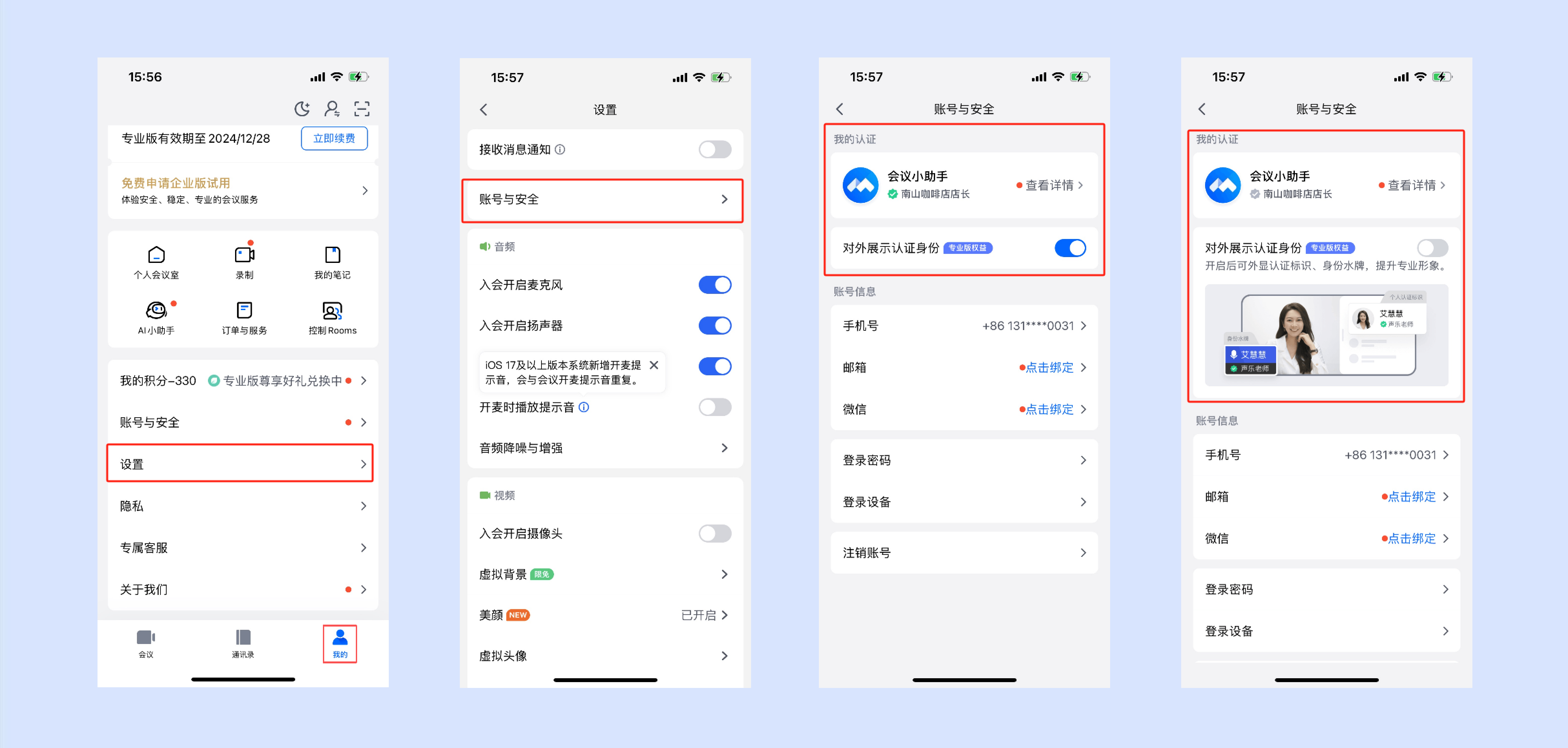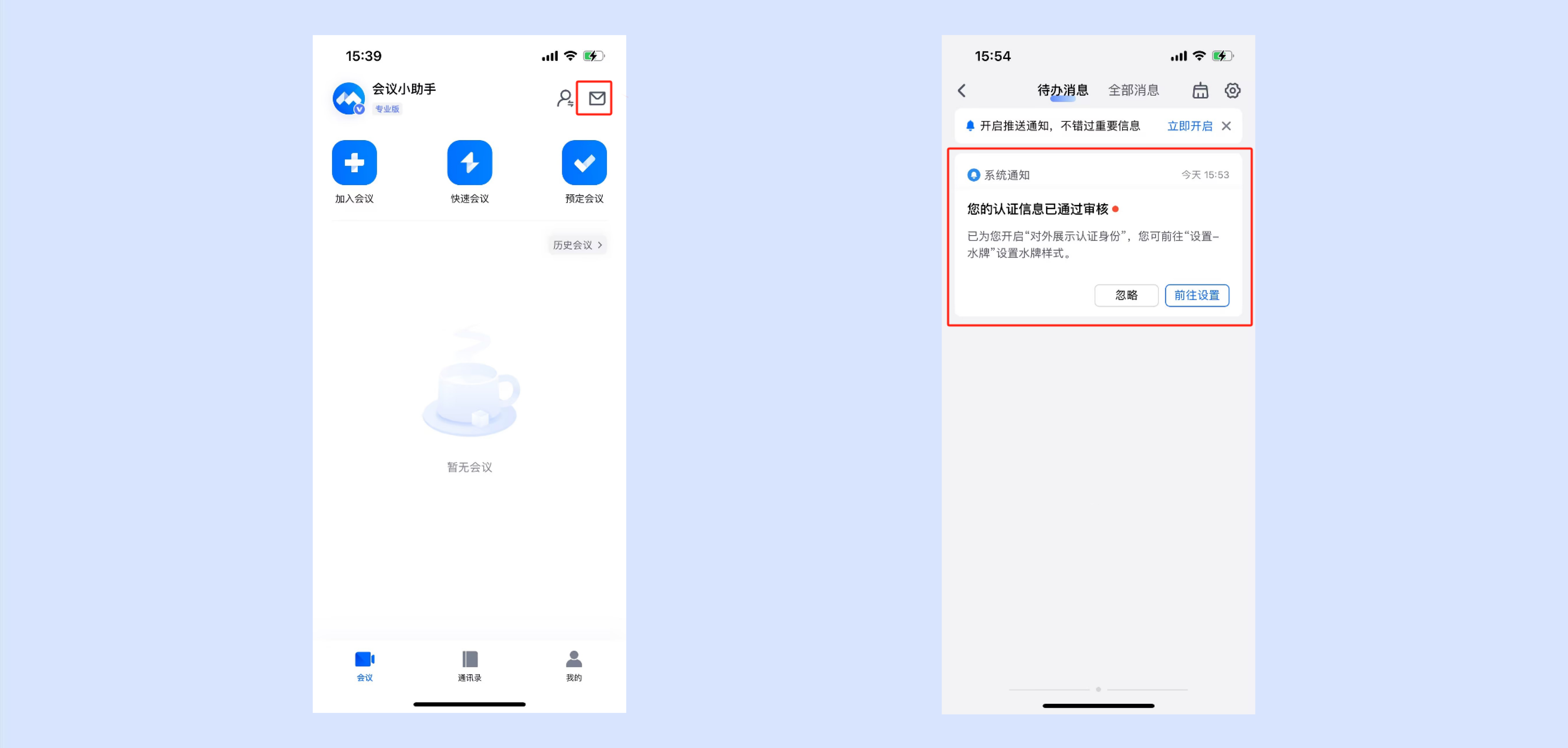 展示认证身份的好处:账号身份防冒充,获得更好的权益保护;资料卡、参会成员列表中展示认证标识,提升可信度;会中展示身份水牌,打造专业形象。