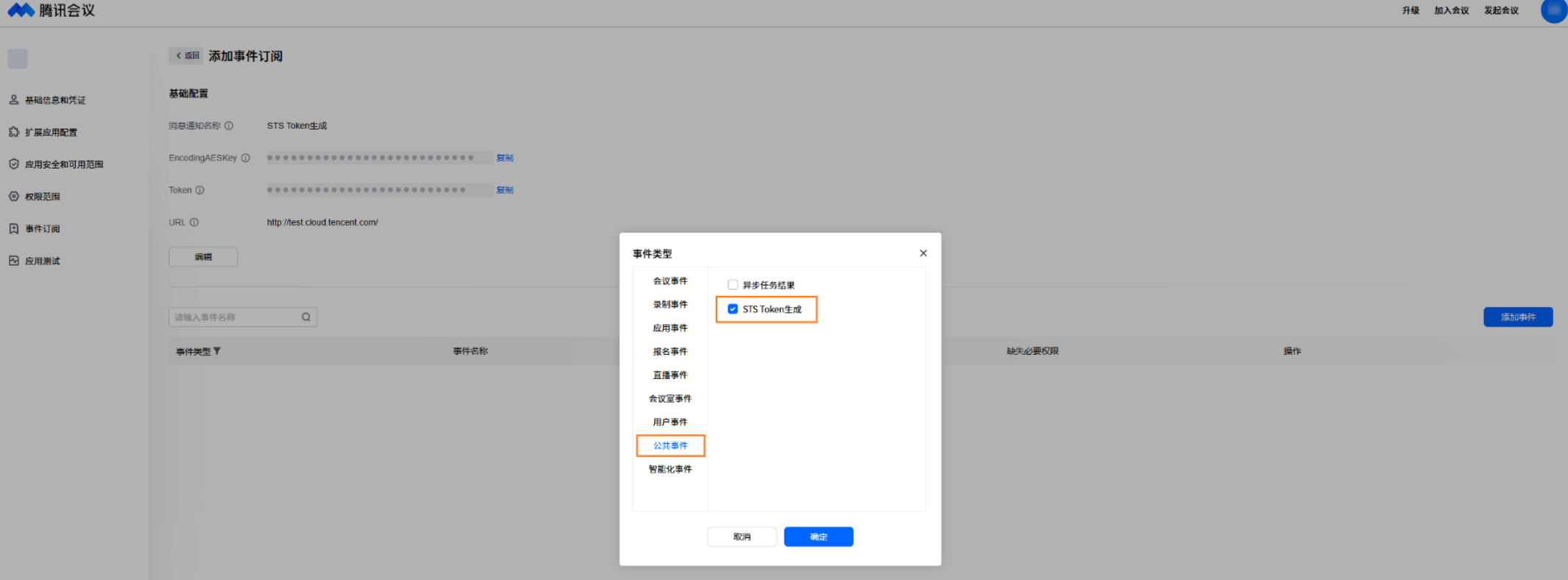 3. 完成基础配置后,单击添加事件,在事件类型中选择公共事件,勾选 STS Token 生成并单击确定。添加事件订阅后,会在触发 STS Token 生成时推送 事件消息。