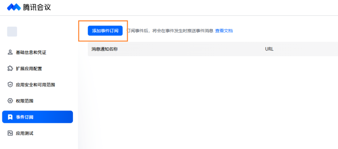 1. 在 腾讯会议企管后台的“自建应用”事件订阅页,单击添加事件订阅。