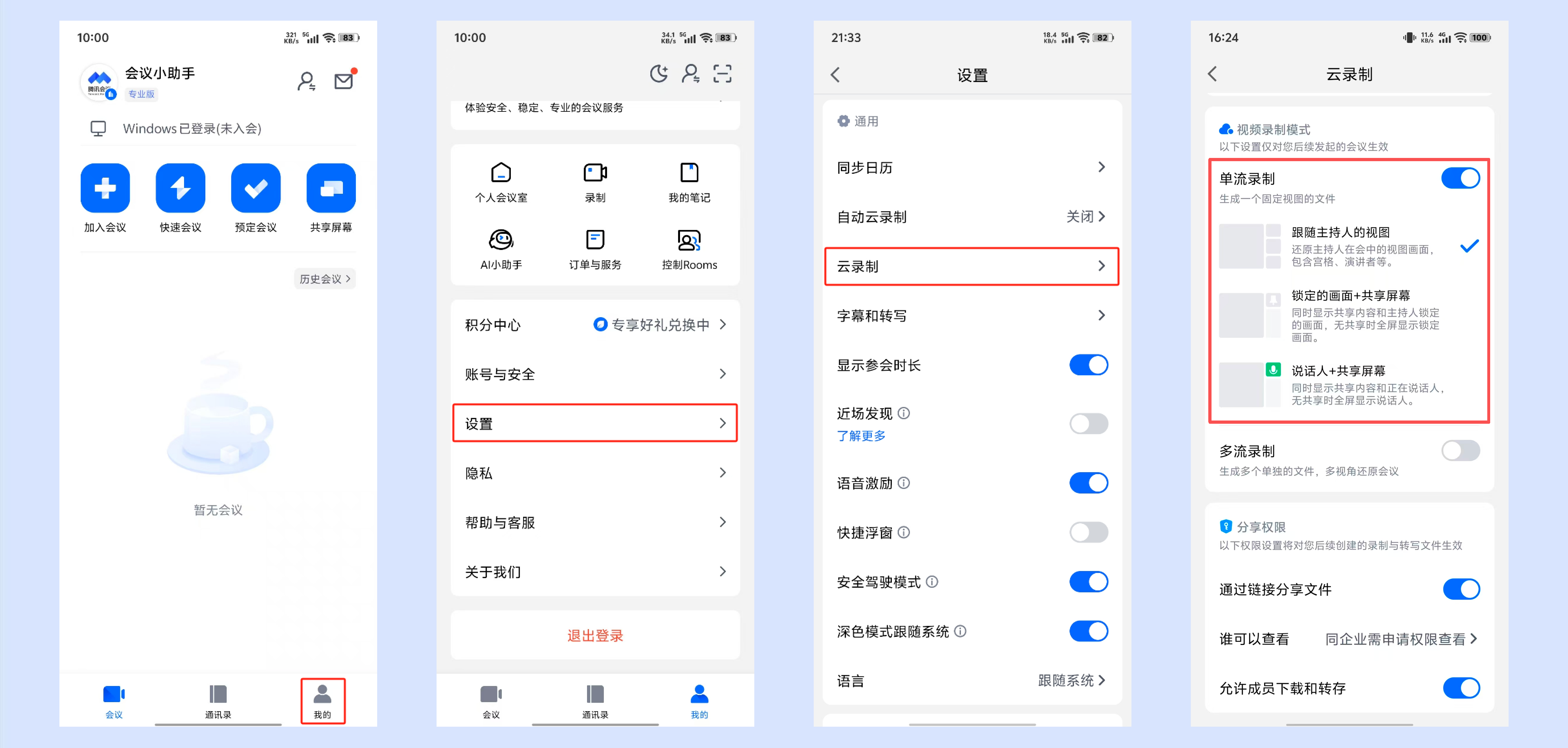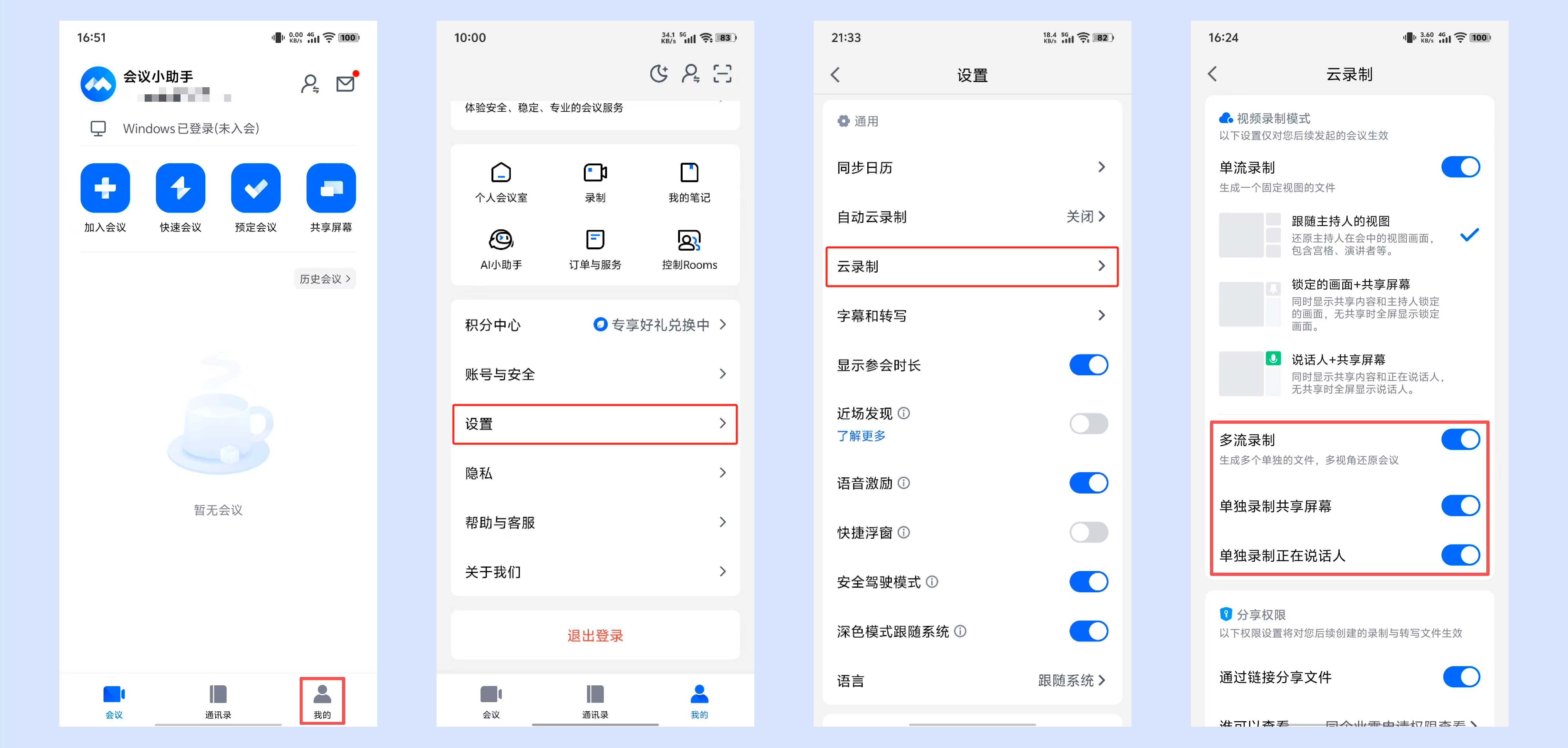 在 App 主界面单击底部我的,选择设置 > 云录制,单击开启多流录制,选择所需要录制的视图,即可对后续发起的会议生效;在会议录制结束后,即可生成多个单独的文件,多视角还原会议。