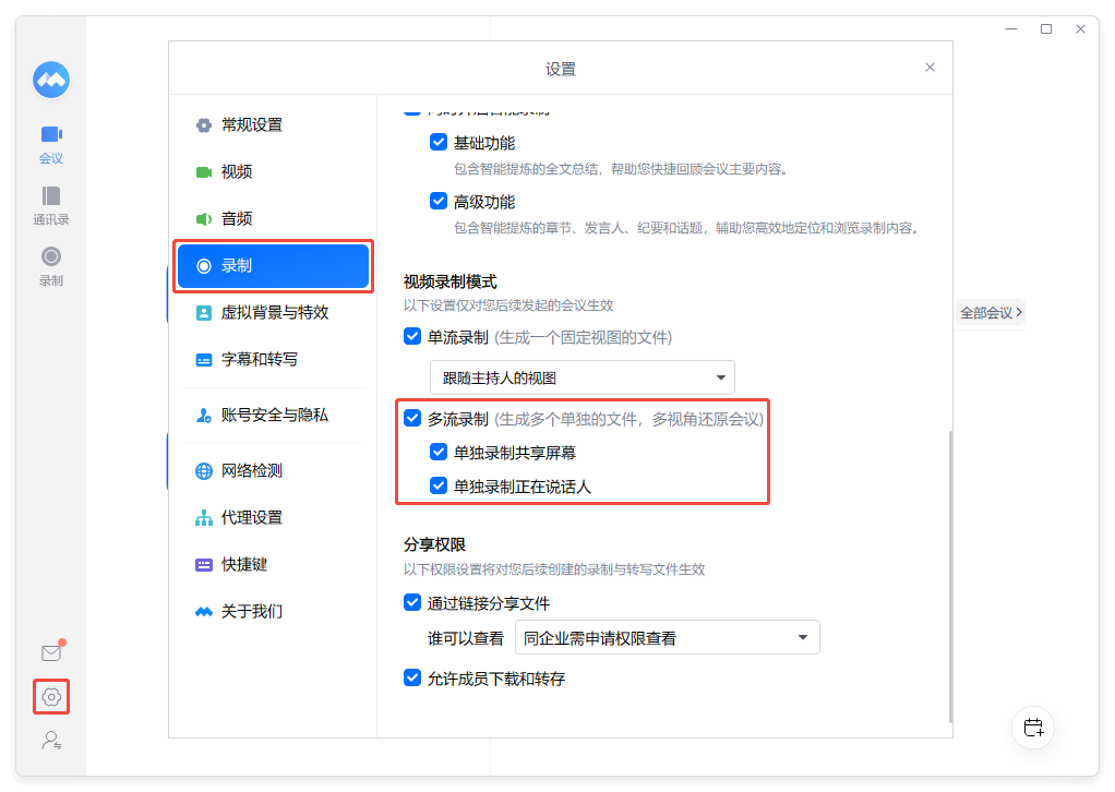 在客户端主界面单击左下角设置,在录制中勾选开启多流录制,选择所需要录制的视图,即可对后续发起的会议生效;在会议录制结束后,即可生成多个单独的文件,多视角还原会议。