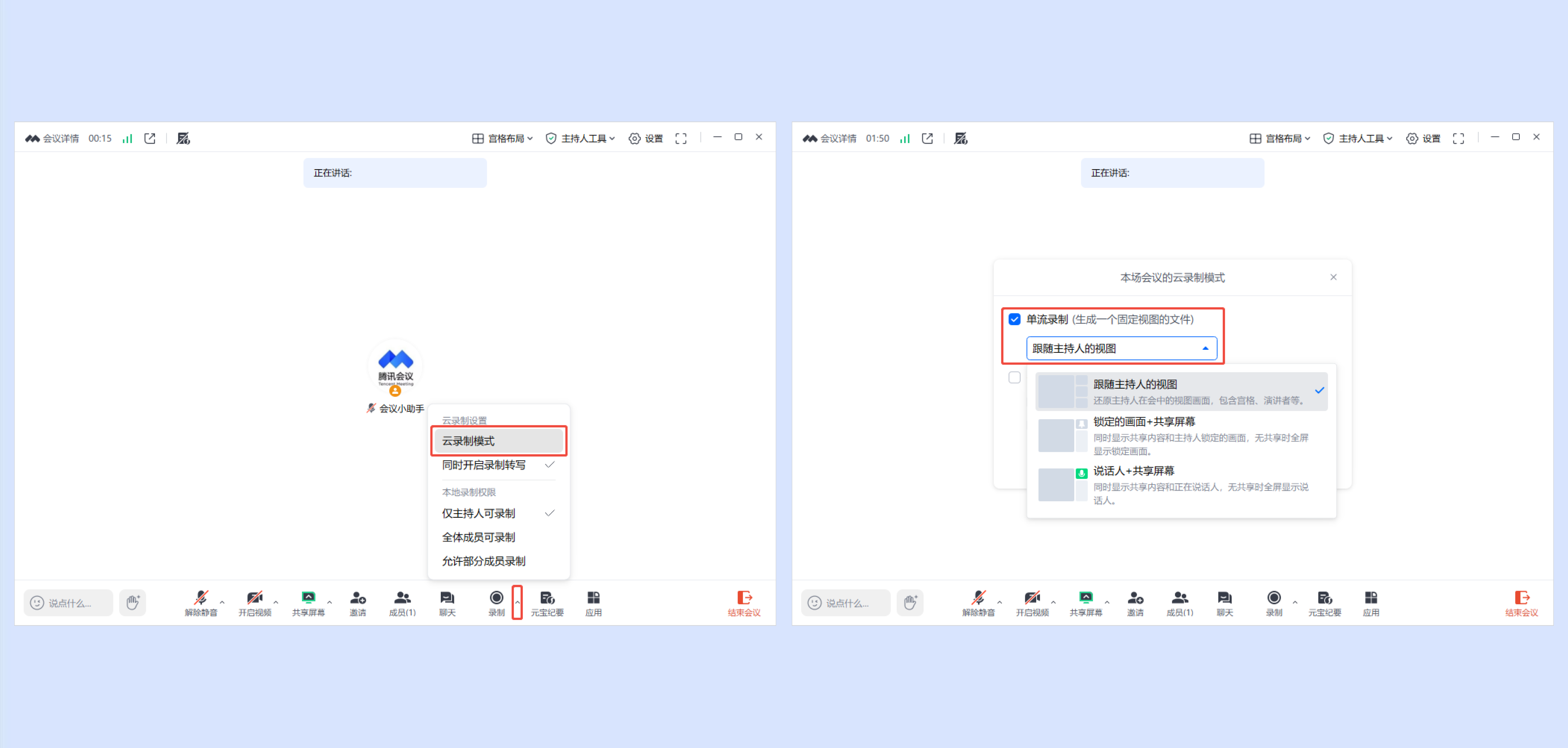 腾讯会议通过快速迭代,目前已支持录制多种布局下的视频画面。