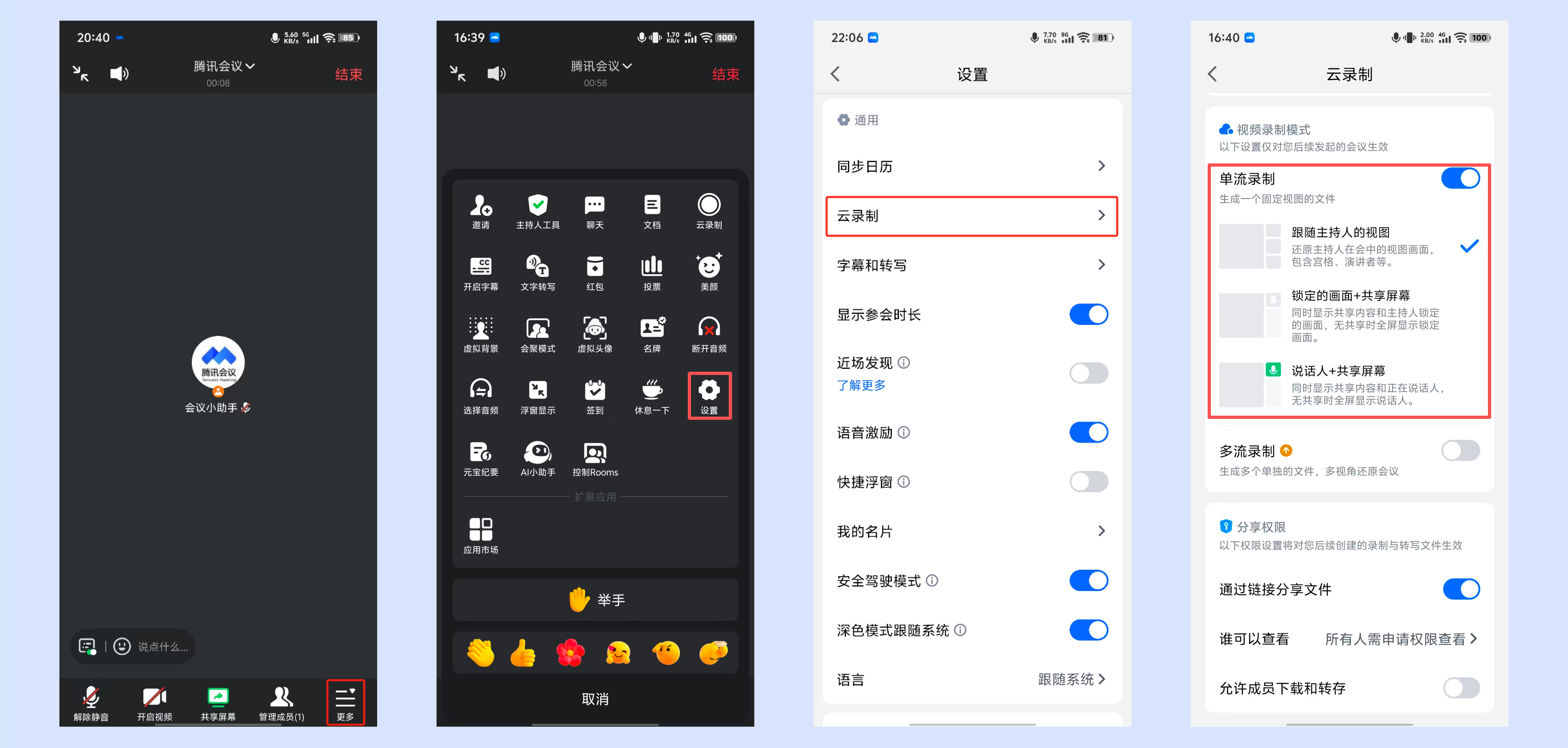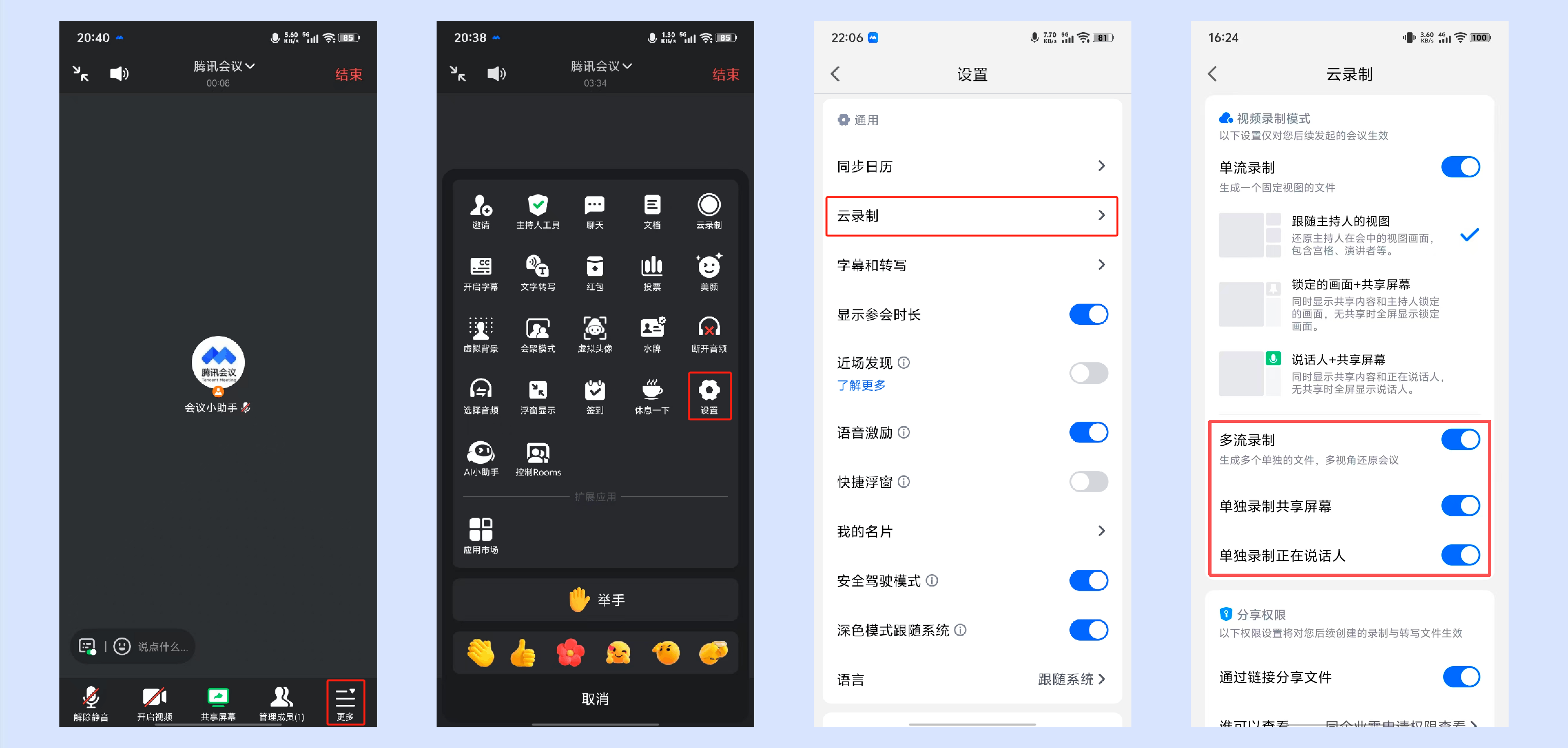 主持人可以在云录制发起前,单击底部工具栏更多,选择设置 > 云录制,勾选开启多流录制,选择所需要录制的视图,返回会中界面,再开启云录制,即可在会议录制结束后生成多个单独的文件,多视角还原会议。