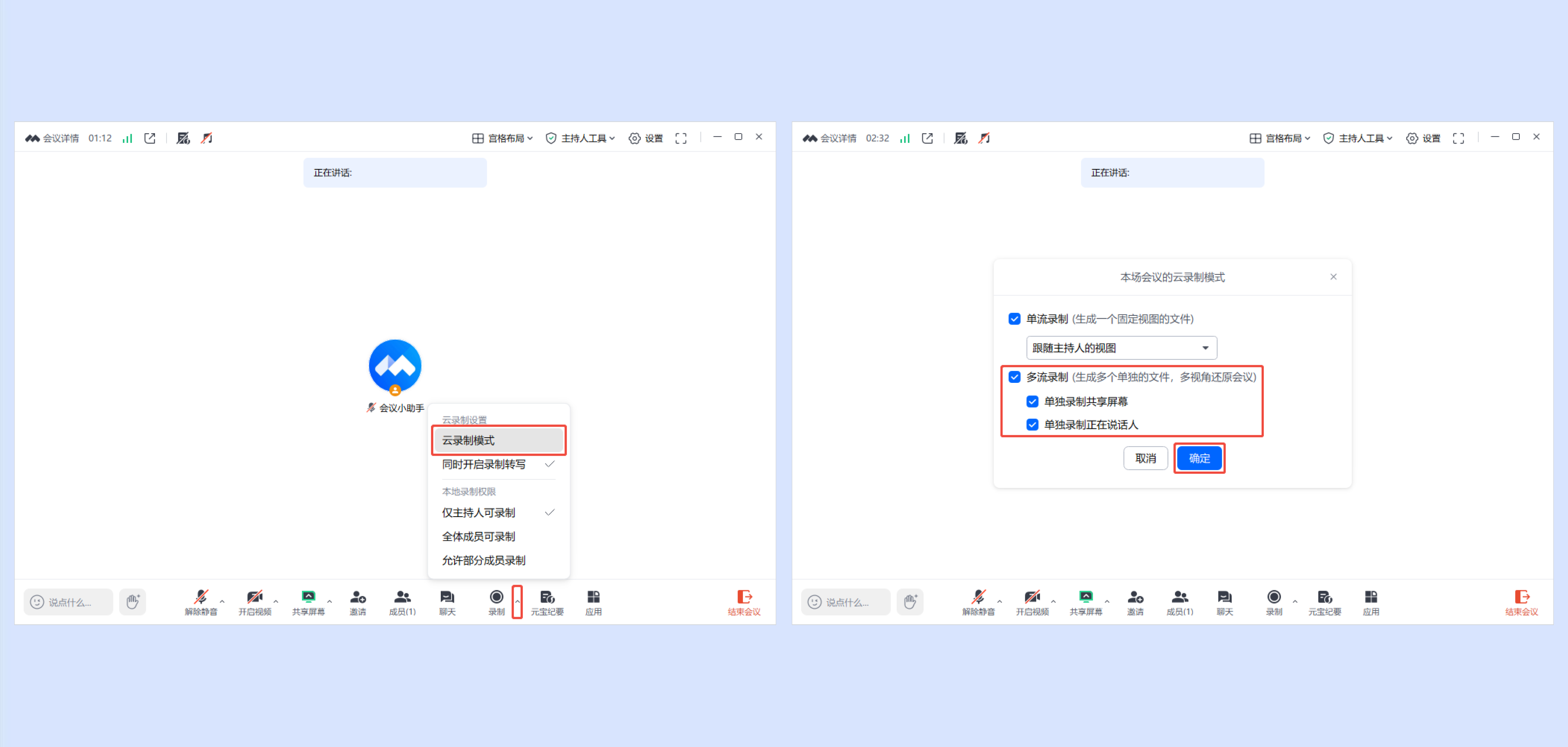 主持人可以在云录制发起前,单击录制旁三角按钮,选择云录制模式,勾选开启多流录制,选择所需要录制的视图,单击确定后,再开启云录制,即可在会议录制结束后生成多个单独的文件,多视角还原会议。