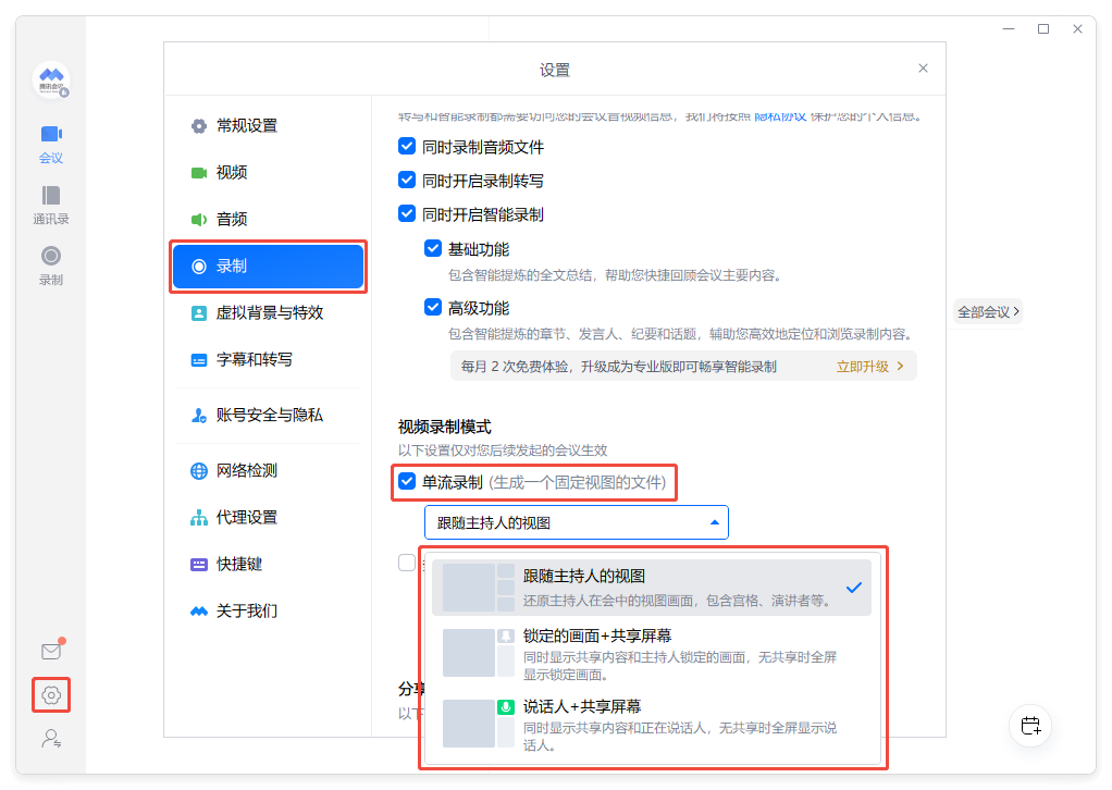单击客户端主界面左下角设置,在录制中勾选单流录制,选择所需要录制的视图,即可对后续发起的会议生效;在会议录制结束后,即可生成一个固定视图的文件。