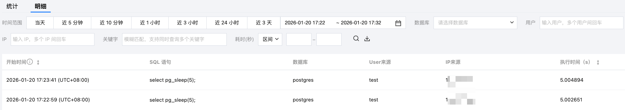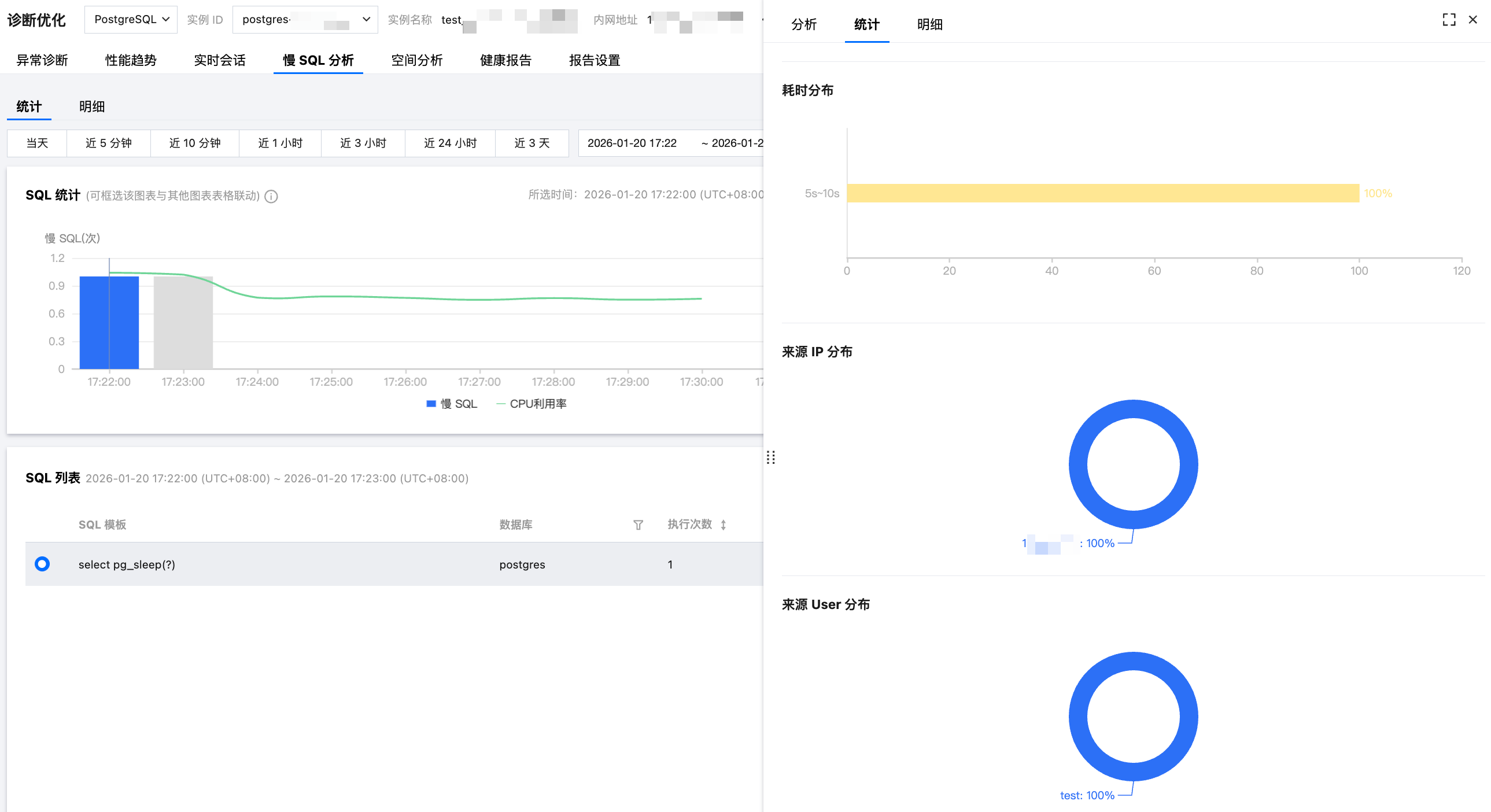 在统计页,您可查看该类型的 SQL(聚合后汇总的)运行的耗时分布、来源 IP 分布、来源 User 分布等信息。
