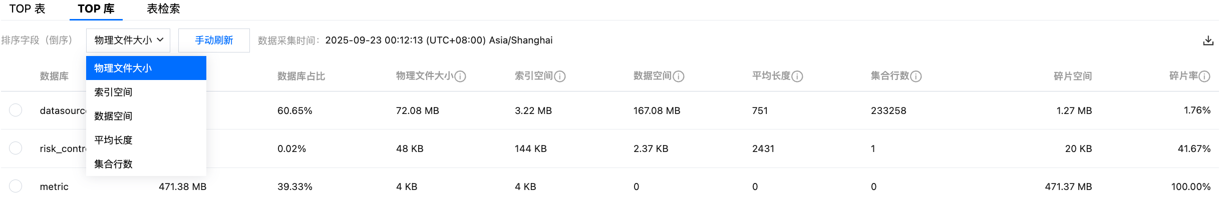 4. 选择 TOP 库页签,选择排序字段(倒序),包括物理文件大小、数据空间、索引空间、平均长度、集合行数,查看 TOP 库列表。