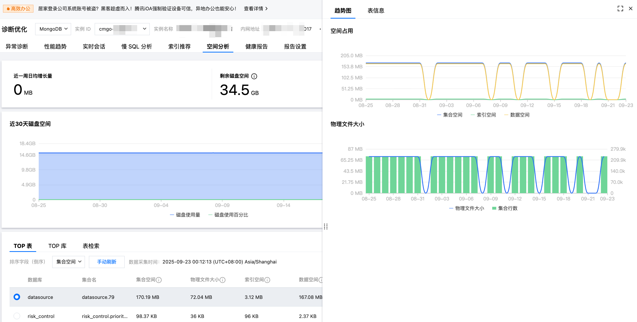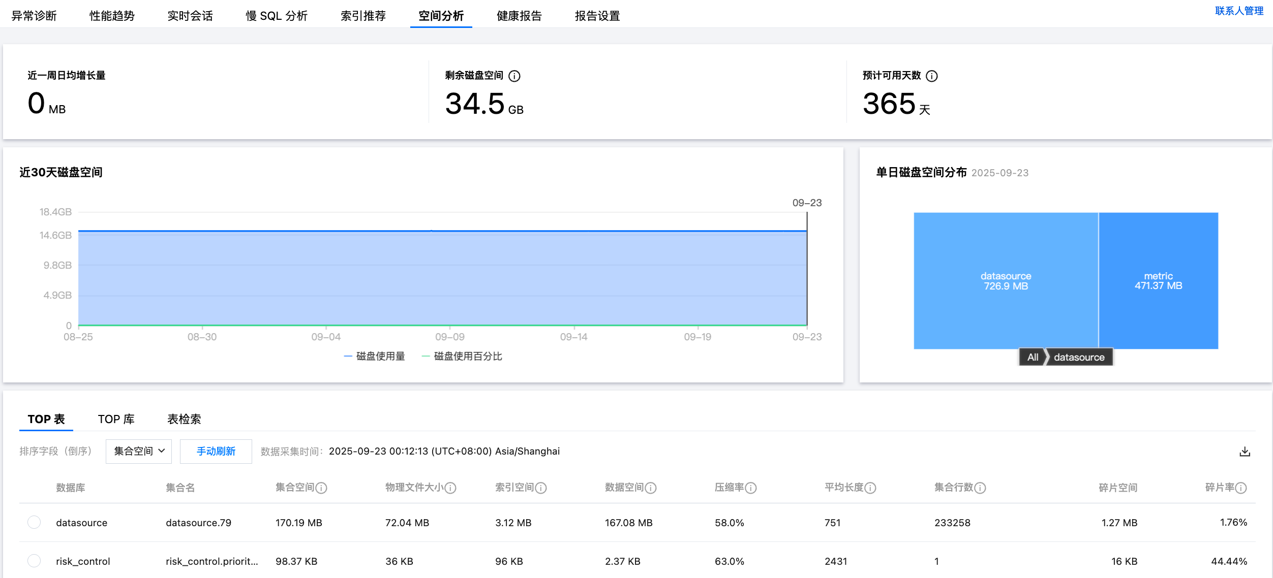 DBbrain 每天凌晨启动对全实例的自动采集分析任务,当实例的采集分析结束后,实例对应的空间分析页面数据刷新为当天的最新数据信息。