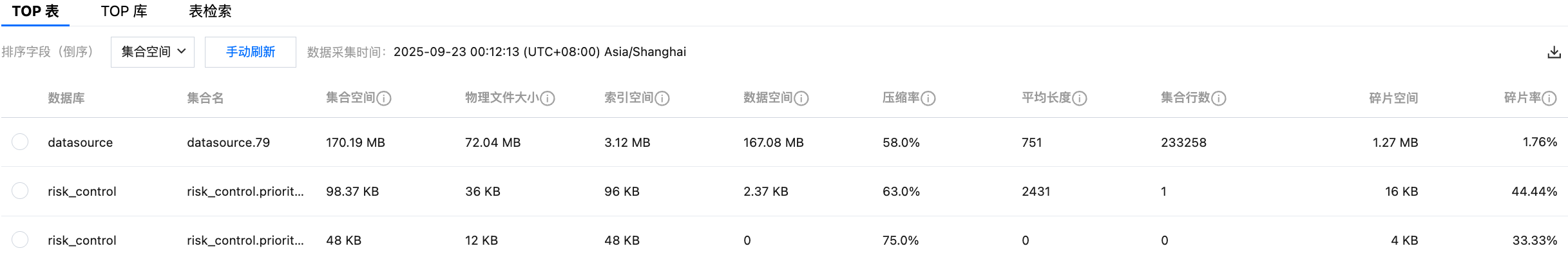 TOP 表为您展示当前占用空间较大表的详情,包括集合名、集合空间、物理文件大小、索引空间、数据空间、压缩率、平均长度和集合行数等。支持选择指定字段倒序排列,您可以通过此信息了解磁盘空间的使用详情,及时进行优化。