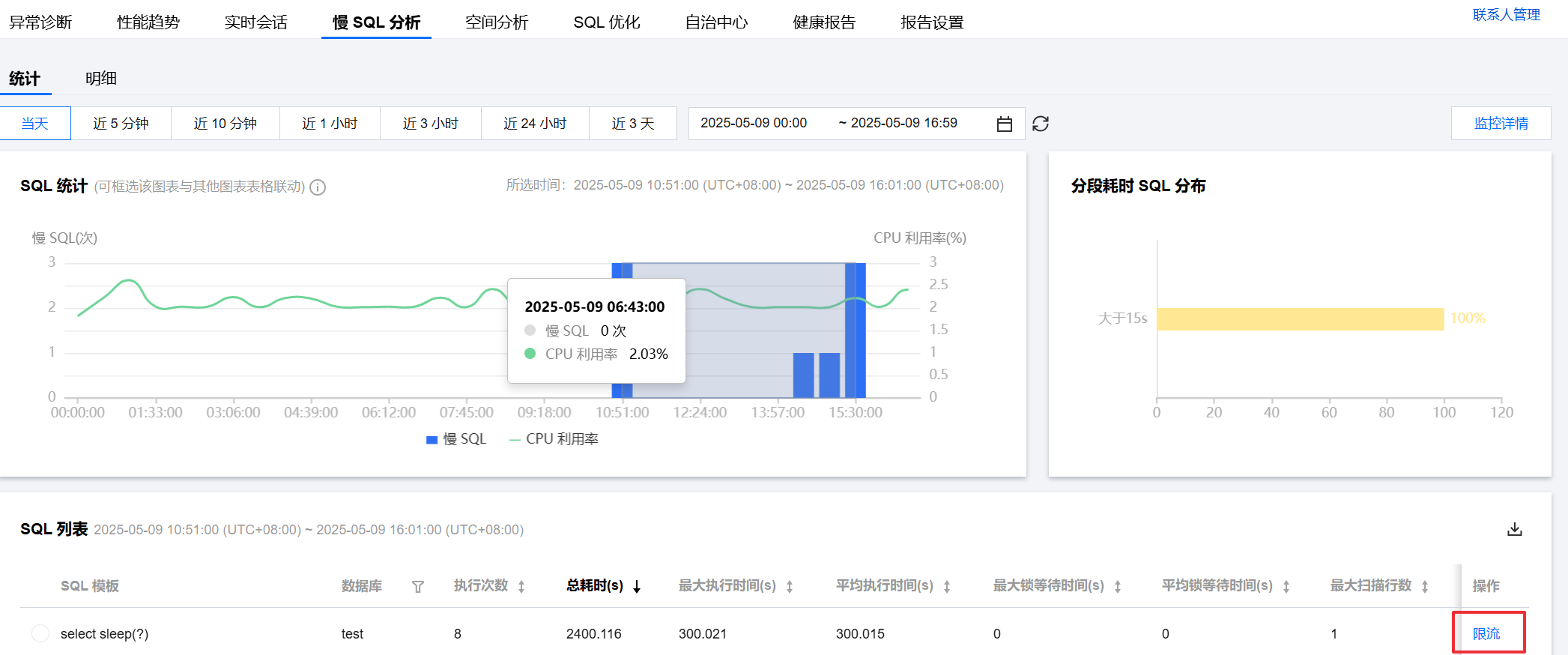 方式三:在诊断优化 > 慢 SQL 分析页面,在 SQL 统计中单击具体的慢 SQL 柱形图,在慢 SQL 列表的操作列单击限流。