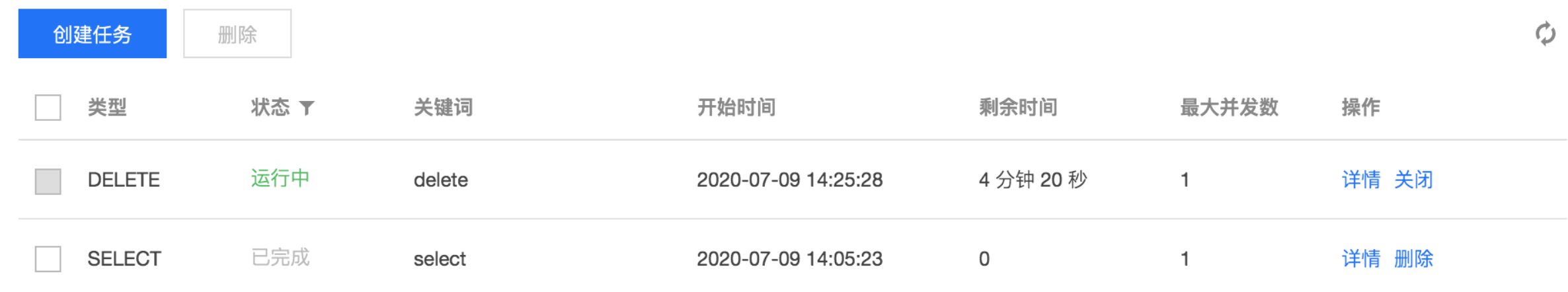 操作 | 查看任务详情:在操作列单击详情,查看任务的开始时间、执行时间、结束时间、已拒绝 SQL 数。 关闭任务:当需要终止状态为运行中的任务时,可在操作列单击关闭,单击确定。 删除任务:当需要删除状态为已终止或已完成的任务时,可单个或批量删除任务。 单个删除:在任务对应的操作列单击删除,单击确定。 批量删除:在 SQL 限流任务列表选择一个或多个待删除的任务,在任务列表上方单击删除,单击确定。 |