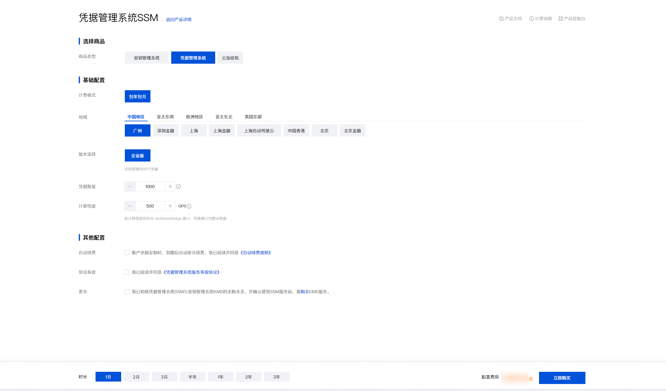 在购买页选择地域、凭据数量、计算性能,阅读并勾选相关费用说明。