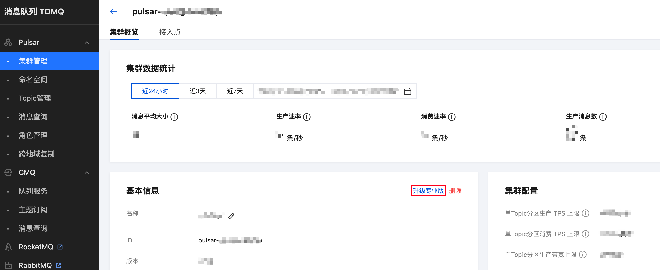 通过 Pulsar 控制台 进入虚拟集群列表页面,点击您想升级的集群 ID 进入实例详情页面,在实例详情页面基本信息框右上角您可以看见“升级专业版”按钮。如您无法找到该按钮,可以联系 腾讯云客服 或 提交工单。