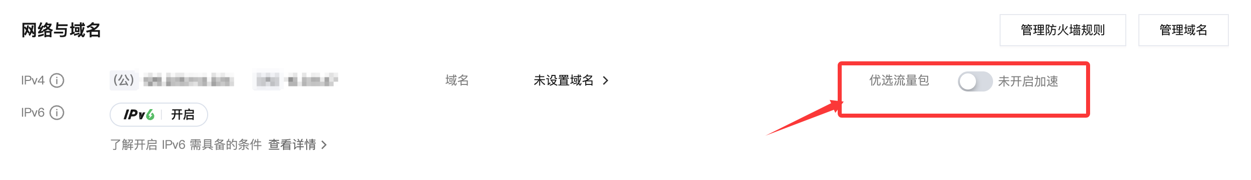 3. 在实例详情页的网络与域名模块,可看到实例上优选流量包默认是未开启加速状态,单击优选流量包的启停按钮。