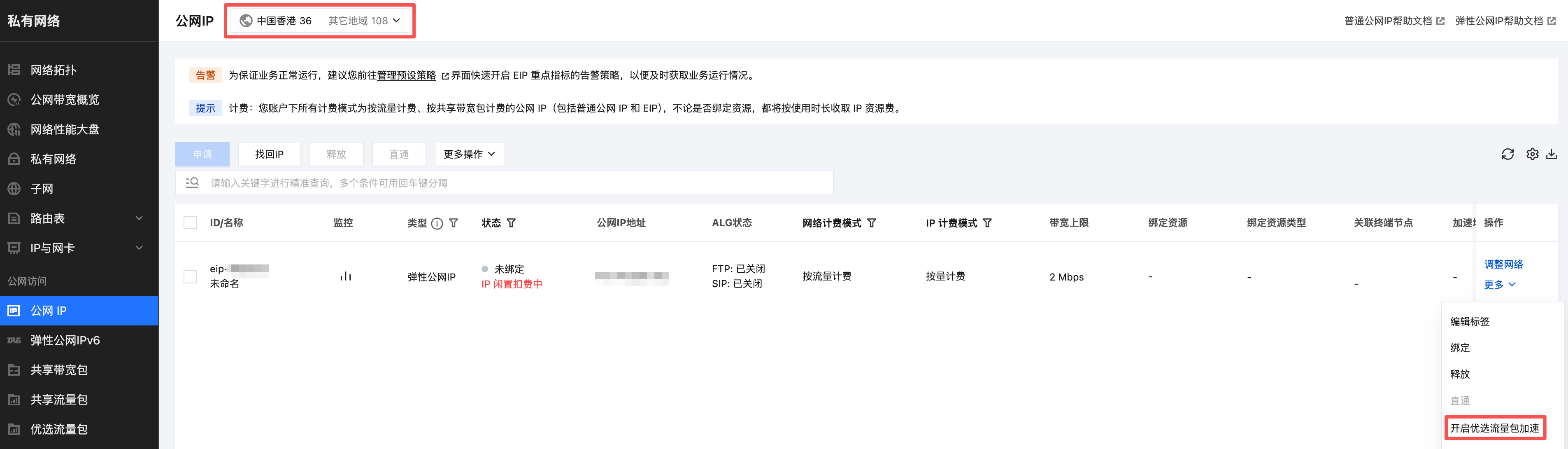 仅标准账号类型支持为常规BGP IP(包含普通公网IP、弹性公网IP)开启优选流量包,若您无法确定账户类型,请参见 弹性公网 IP-账户类型说明。
