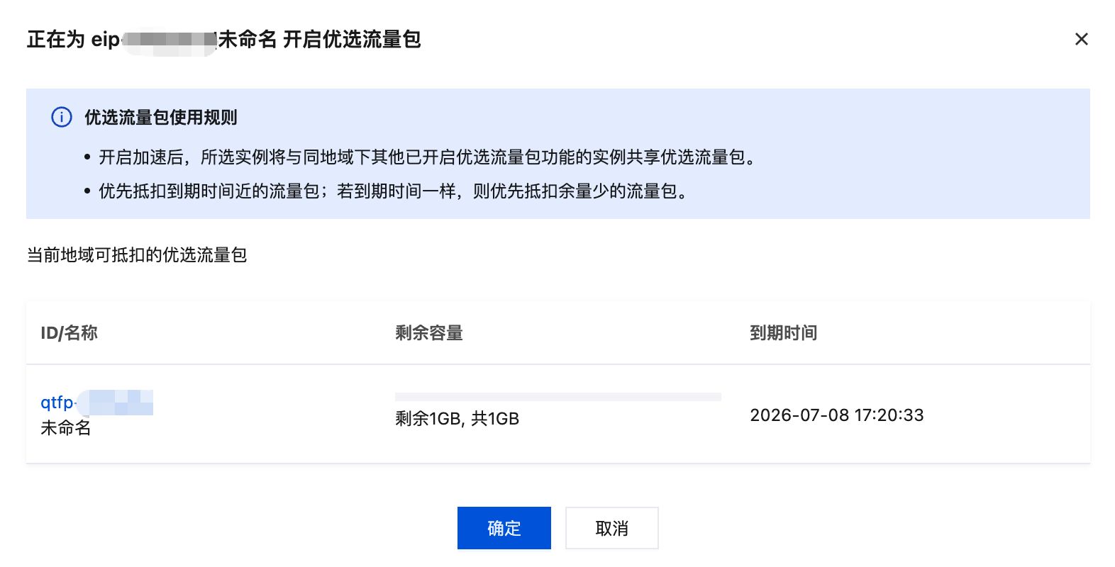 3. 在开启优选流量包界面,显示当前地域下有效状态的优选流量包,确认优选流量包的使用规则后,单击确定即可为实例开启流量加速。