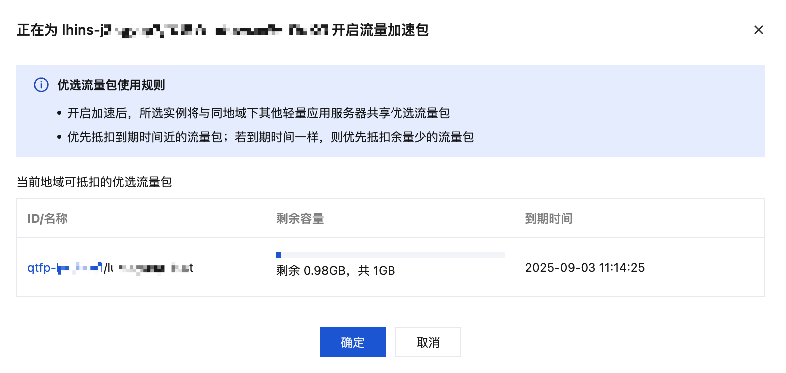 4. 在开启流量加速包界面,显示当前地域下有效状态的优选流量包,确认优选流量包的使用规则后,单击确定即可为实例开启流量加速。