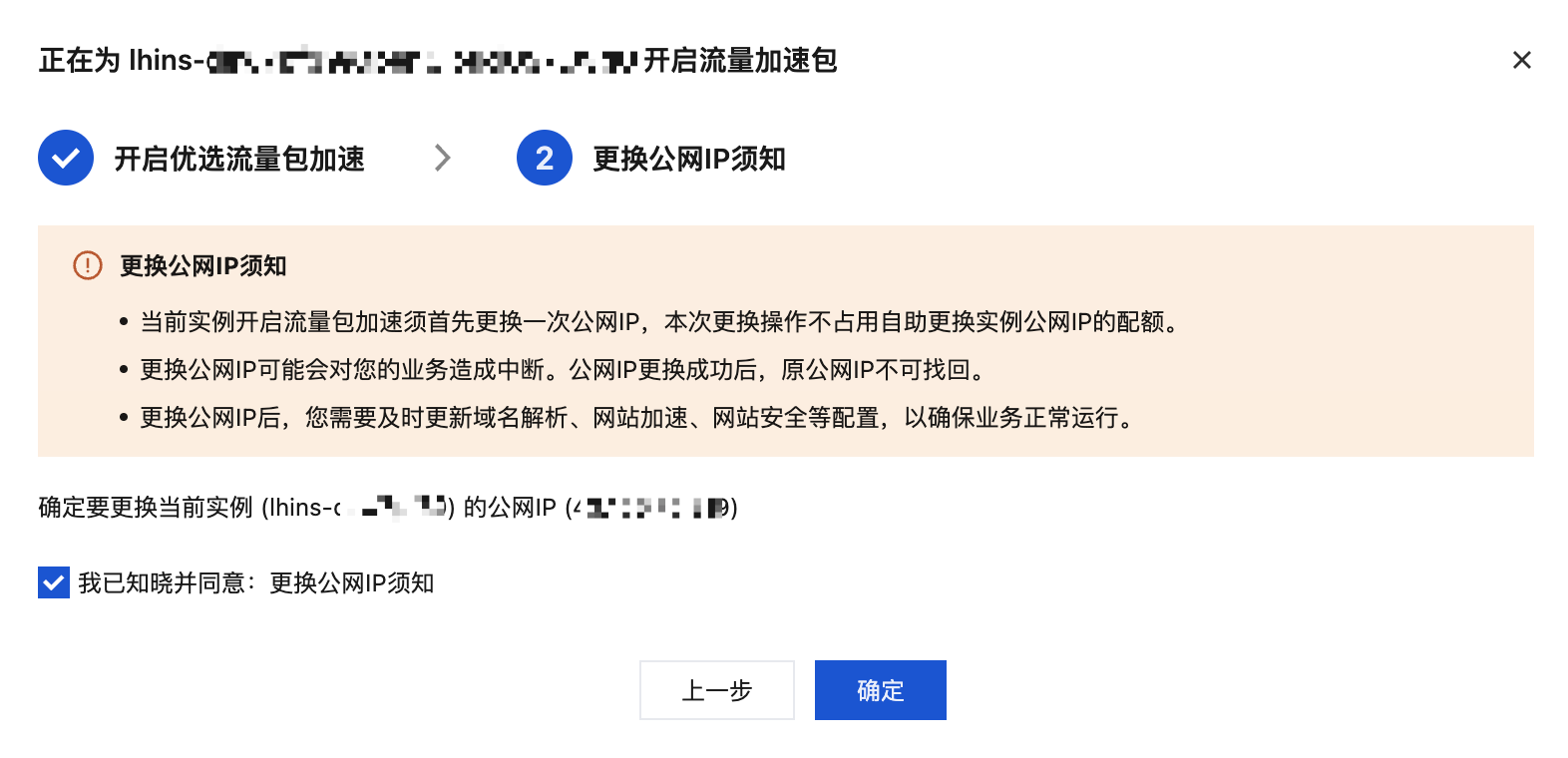 2. 开启加速:开启后,轻量应用服务器、按流量计费和按主流量带宽包计费的常规 BGP IP(包含普通公网 IP、弹性公网 IP)在中国香港、新加坡到中国大陆方向的访问质量将得到加速,业务访问时延更低、质量更高且更稳定。