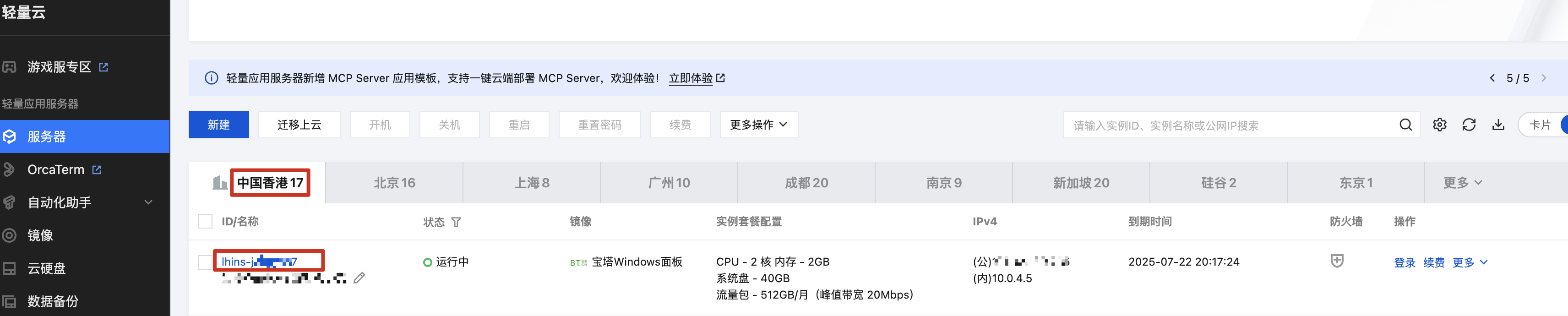 2. 选择中国香港地域,找到需要开启优选加速的轻量应用服务器,单击实例 ID 进入实例详情页。