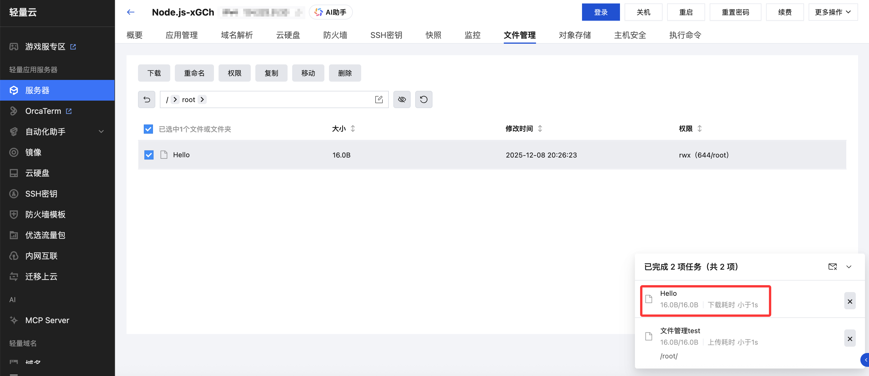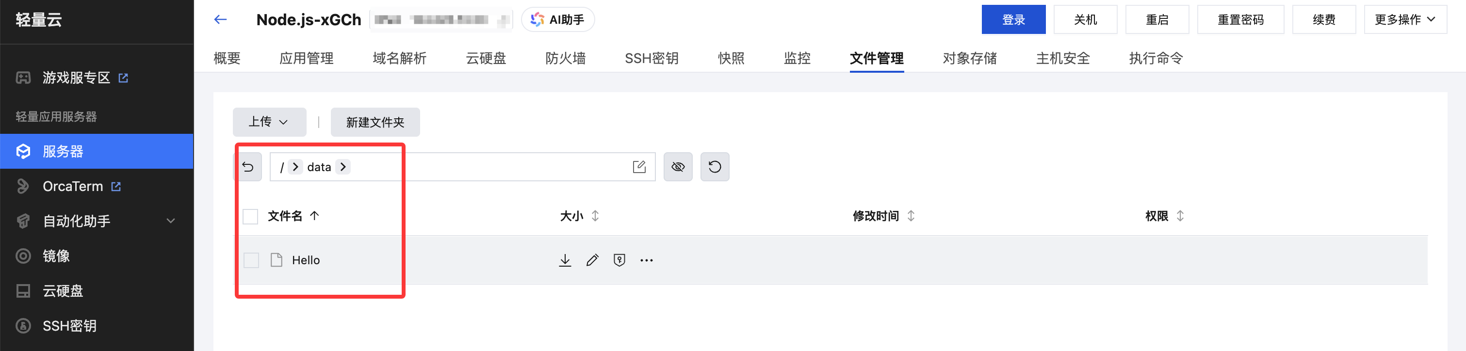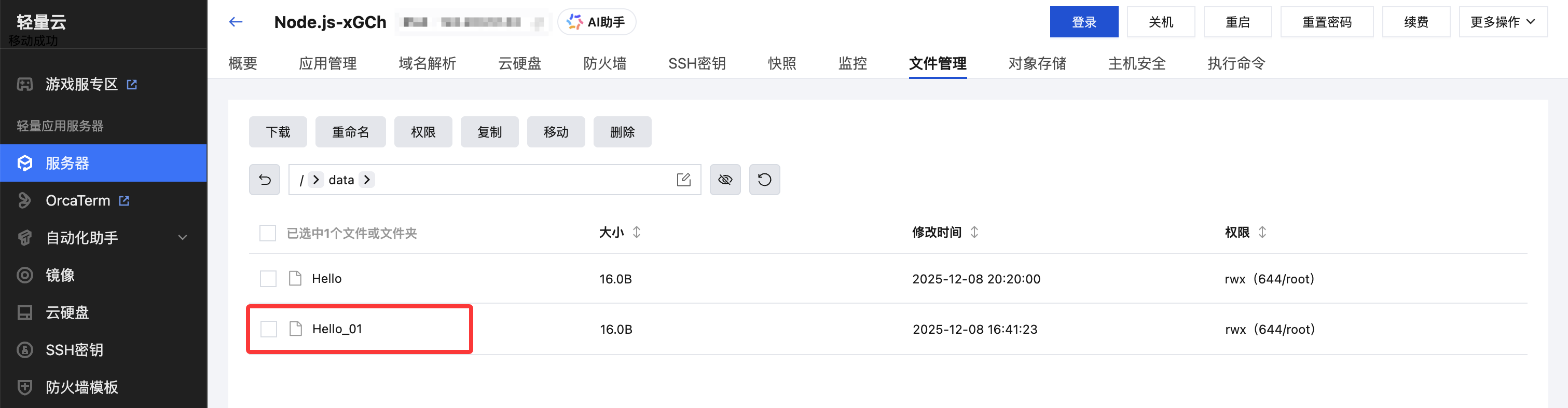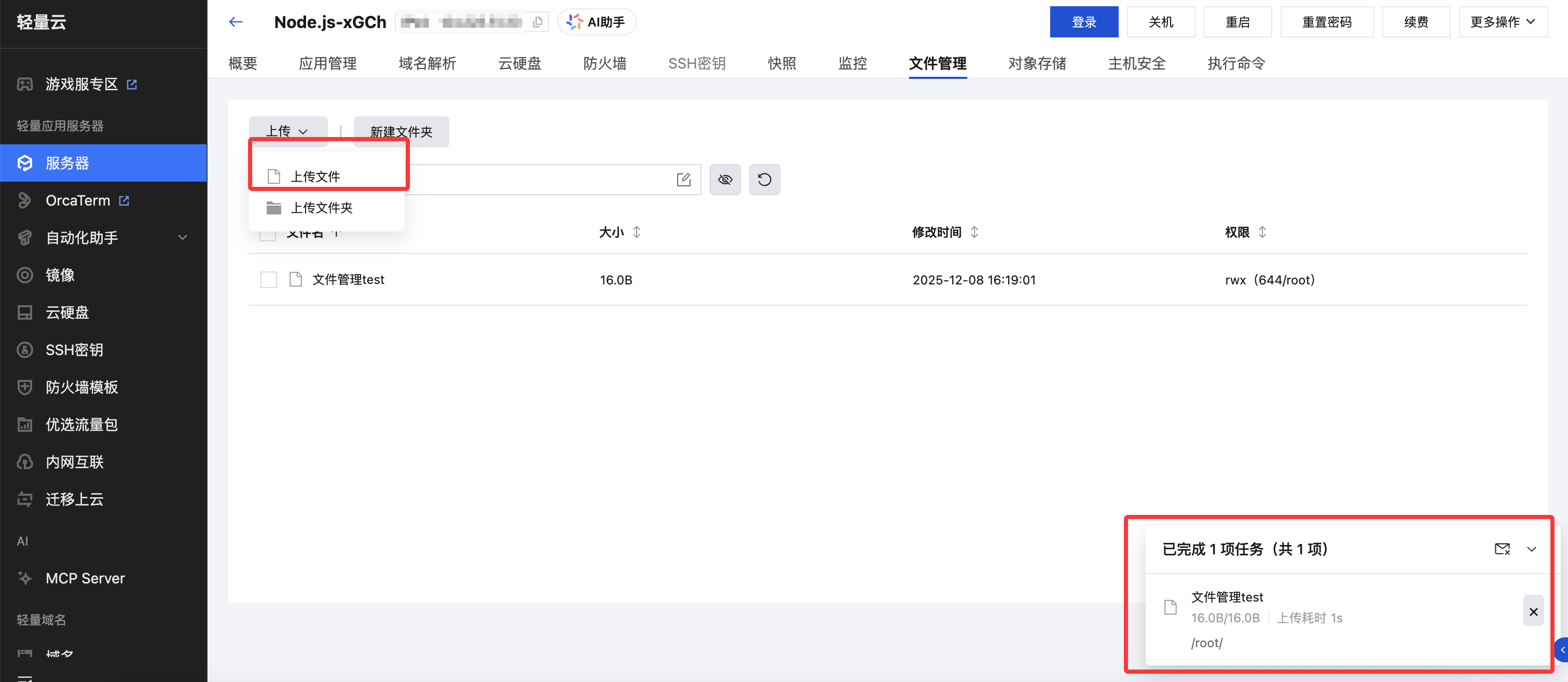 4. 上传成功后,可在实例的目标路径找到上传的文件,并在控制台查看文件名、大小、修改时间和权限。