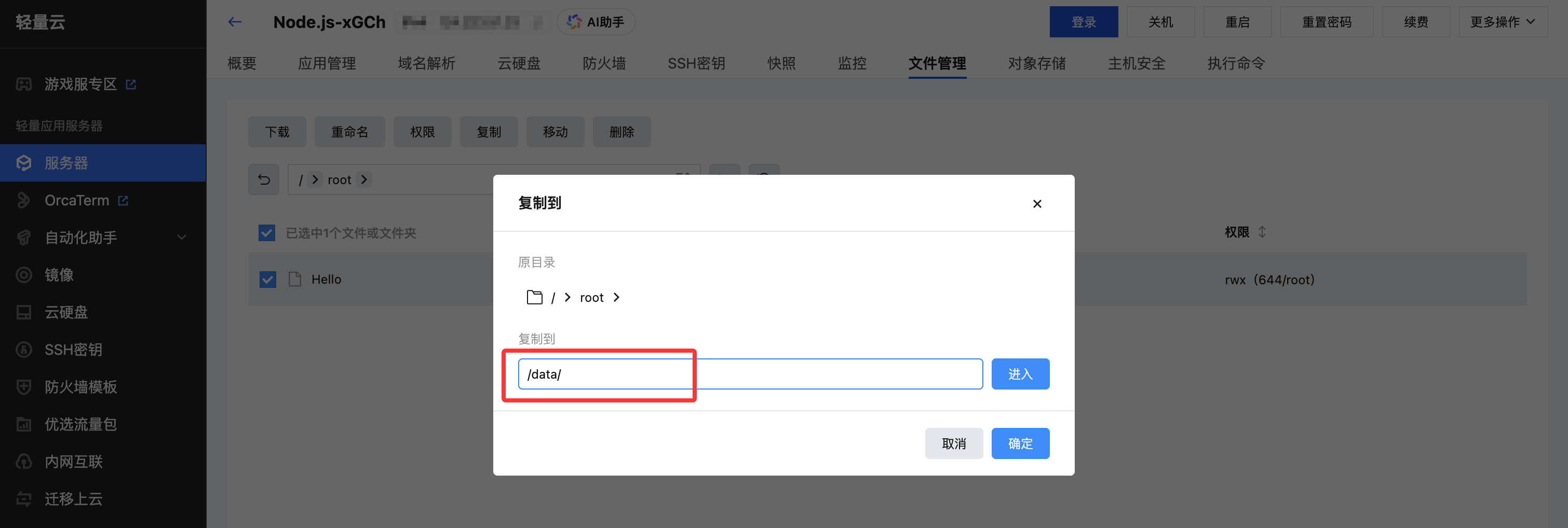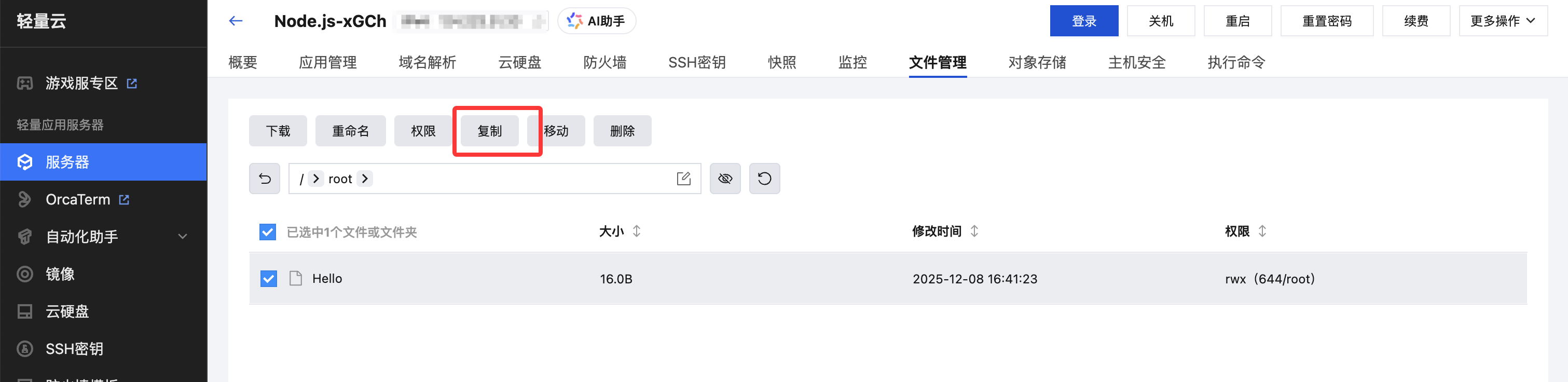 2. 在实例详情页中,选择文件管理页签,输入目标文件路径,勾选需要复制的文件,单击复制。