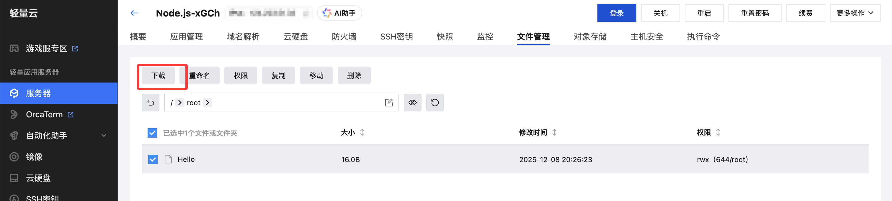2. 在实例详情页中,选择文件管理页签,输入目标文件路径,勾选需要下载的文件,单击下载。同时支持批量文件下载。