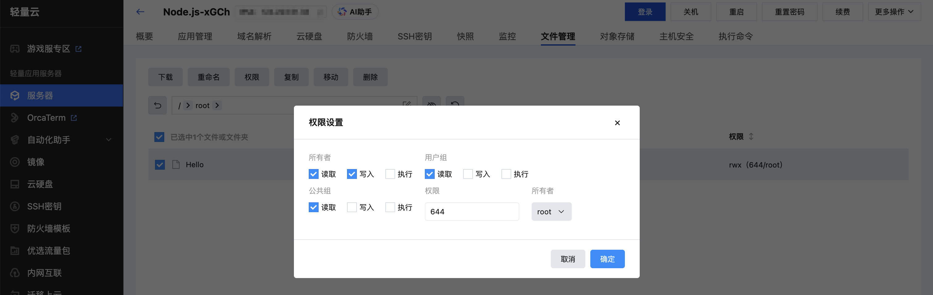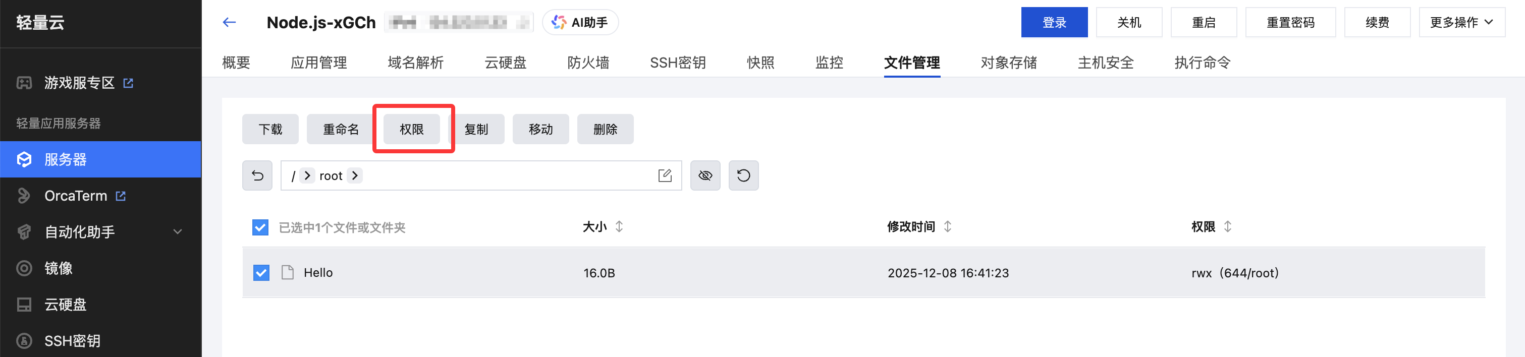 2. 在实例详情页中,选择文件管理页签,输入目标文件路径,勾选需要修改权限的文件,单击权限。