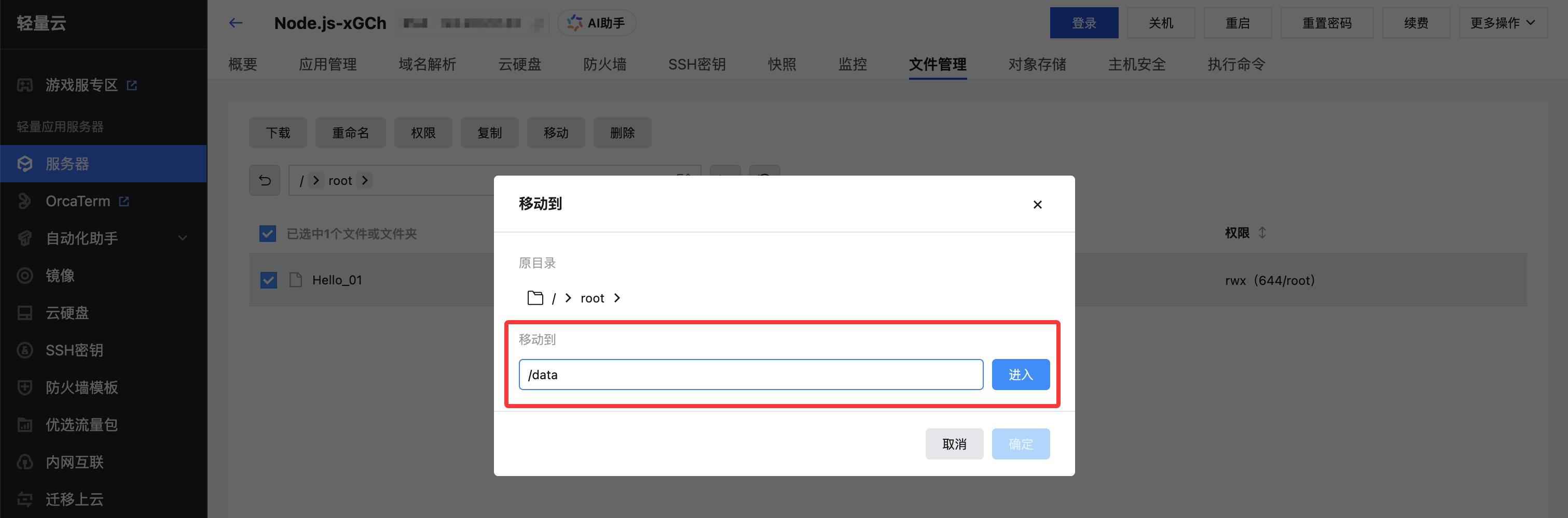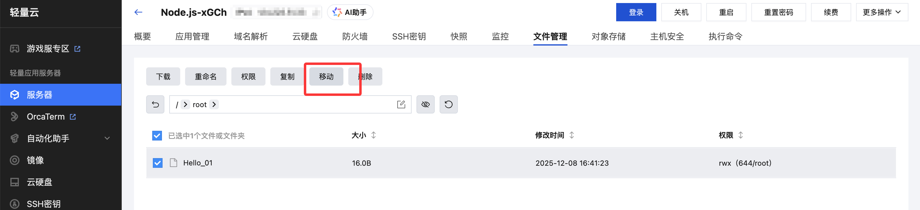 2. 在实例详情页中,选择文件管理页签,输入源文件路径,勾选需要移动的文件,单击移动。