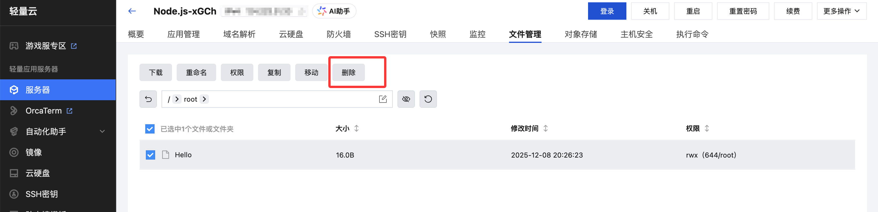 2. 在实例详情页中,选择文件管理页签,输入目标文件路径,勾选需要删除的文件,单击删除。并在弹窗中单击确定。