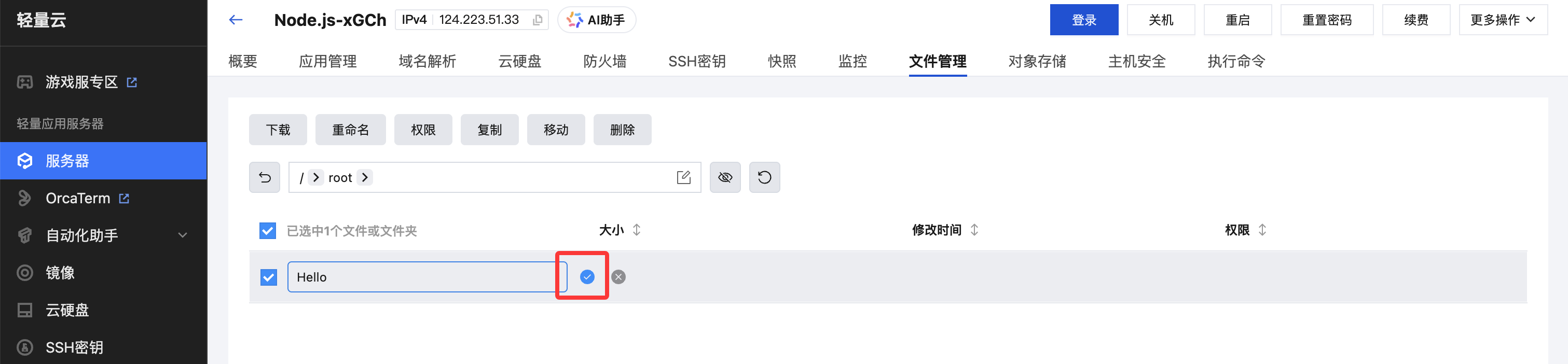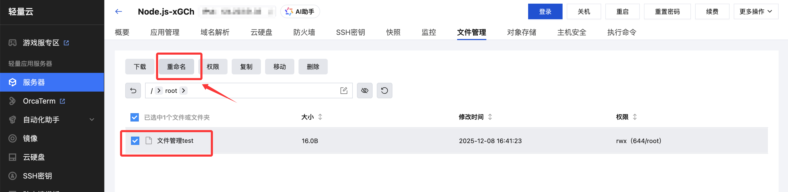 2. 在实例详情页中,选择文件管理页签,输入目标文件路径,勾选需要重命名的文件,单击重命名。