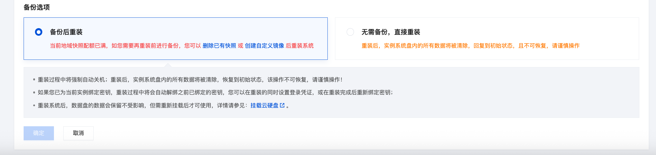 若您选择无需备份,直接重装,重装后,实例系统盘内的所有数据将被清除,恢复到初始状态,且不可恢复,请谨慎操作。