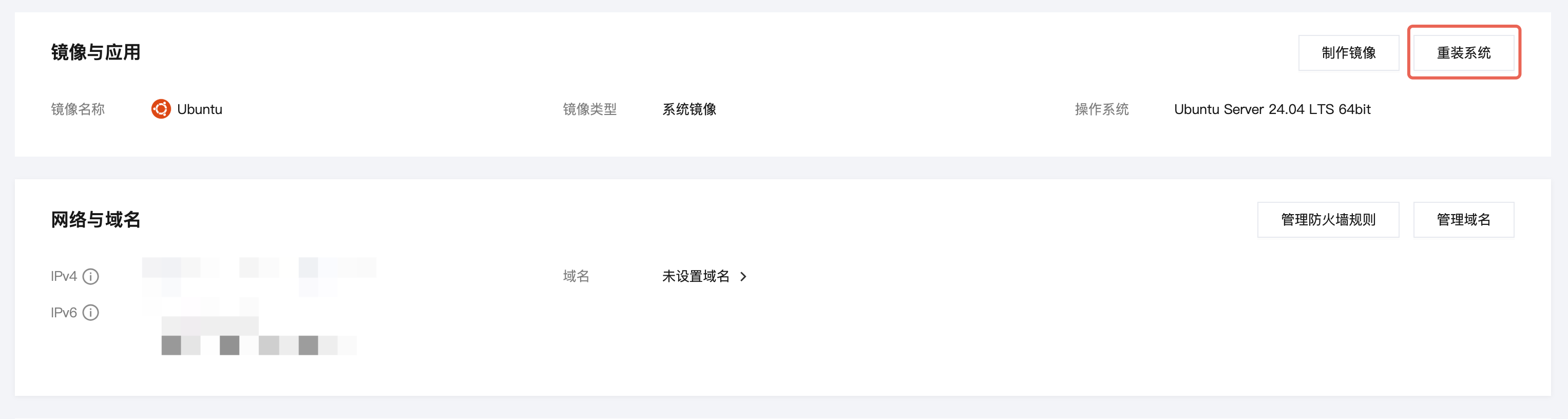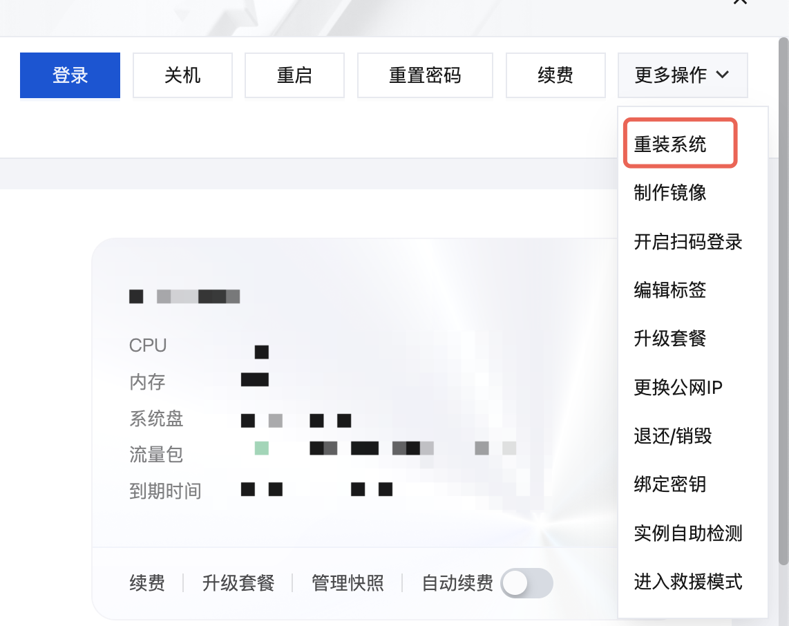 首先进入实例详情页。在概要页签中,单击镜像与应用中的重装系统。如下图所示: