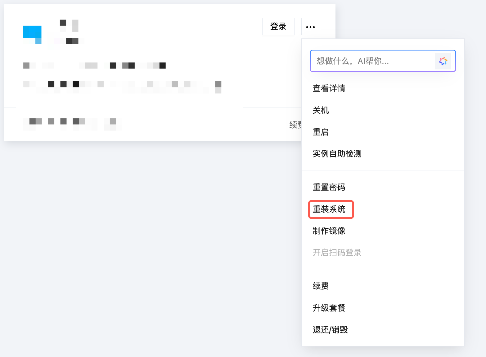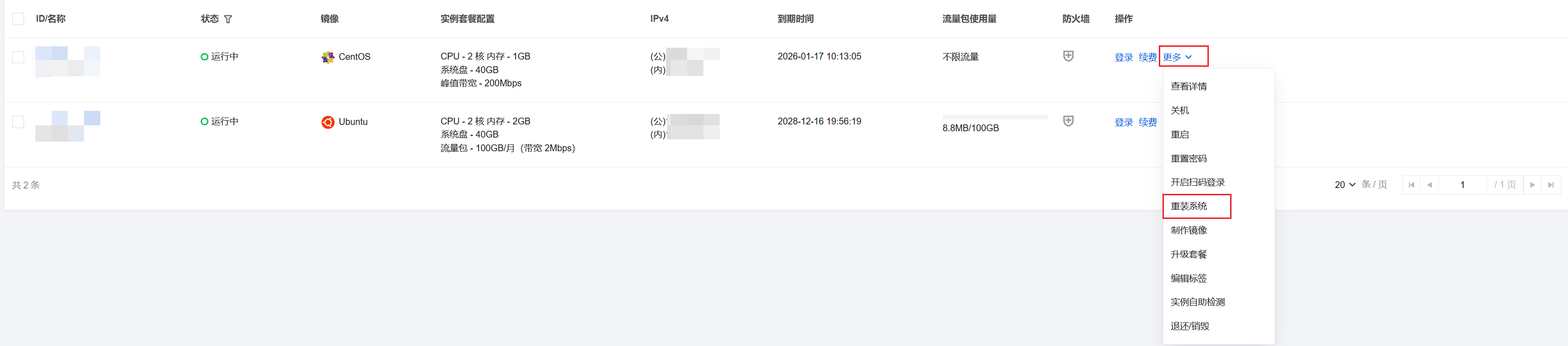 2. 在服务器列表中,找到待重装系统的实例。根据实际的操作习惯,选择不同的方式进行重装。