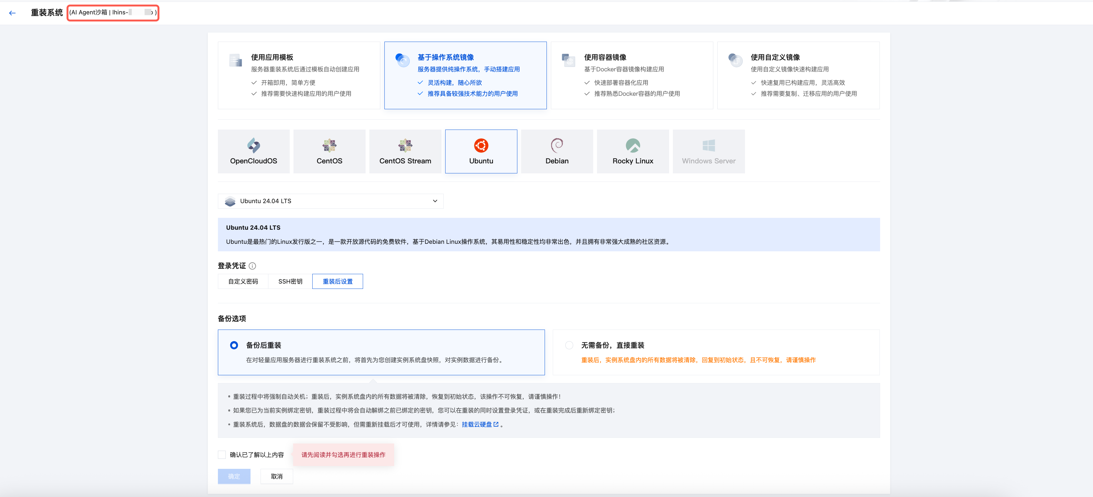 3. 在重装系统页面中,您可在上方再次确认需要重装的实例是否正确,确认无误后选择重装系统需要的方式:应用模板、系统镜像、容器镜像、自定义镜像(个人镜像或共享镜像),设置登录凭证(密码或 SSH 密钥),并按需选择是否需要备份,阅读重装确认事项后,勾选确认已了解以上内容,单击确定。如下图所示: