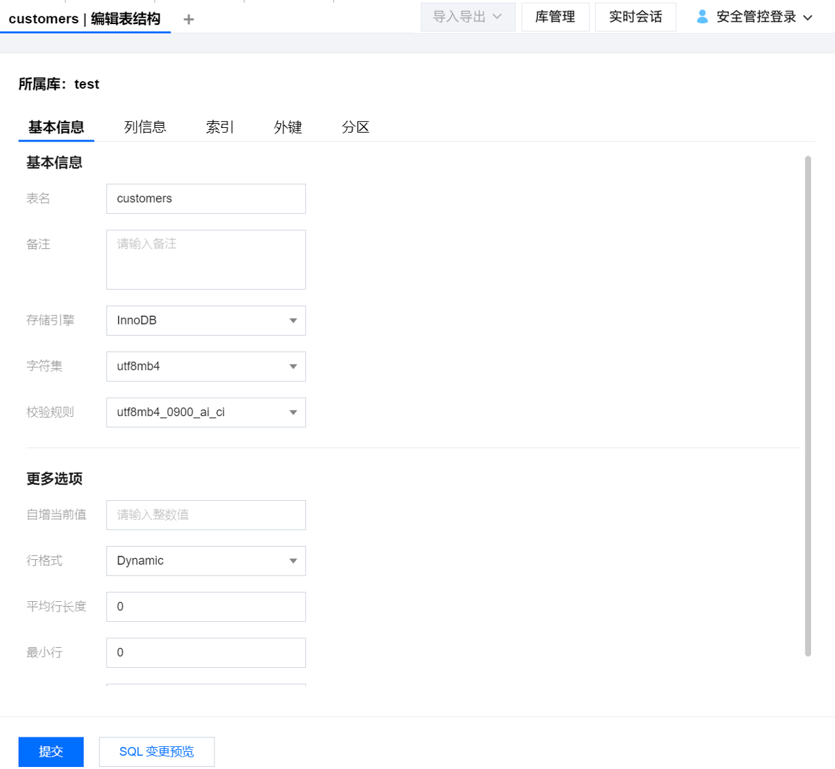 在左侧库表栏,鼠标悬停至表名称处,选择操作 > 编辑表结构,可编辑表的基本信息、列信息、索引、外键和分区信息,并支持对 SQL 变更进行预览。