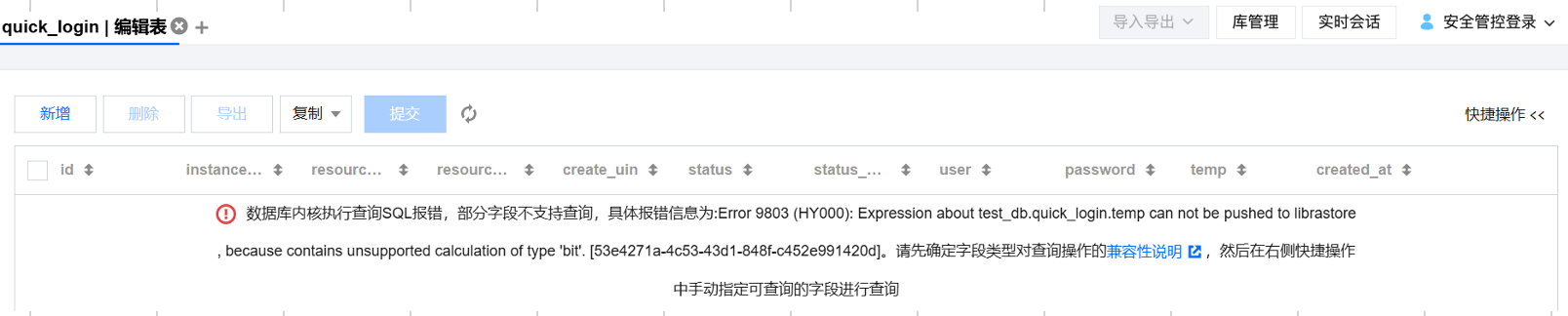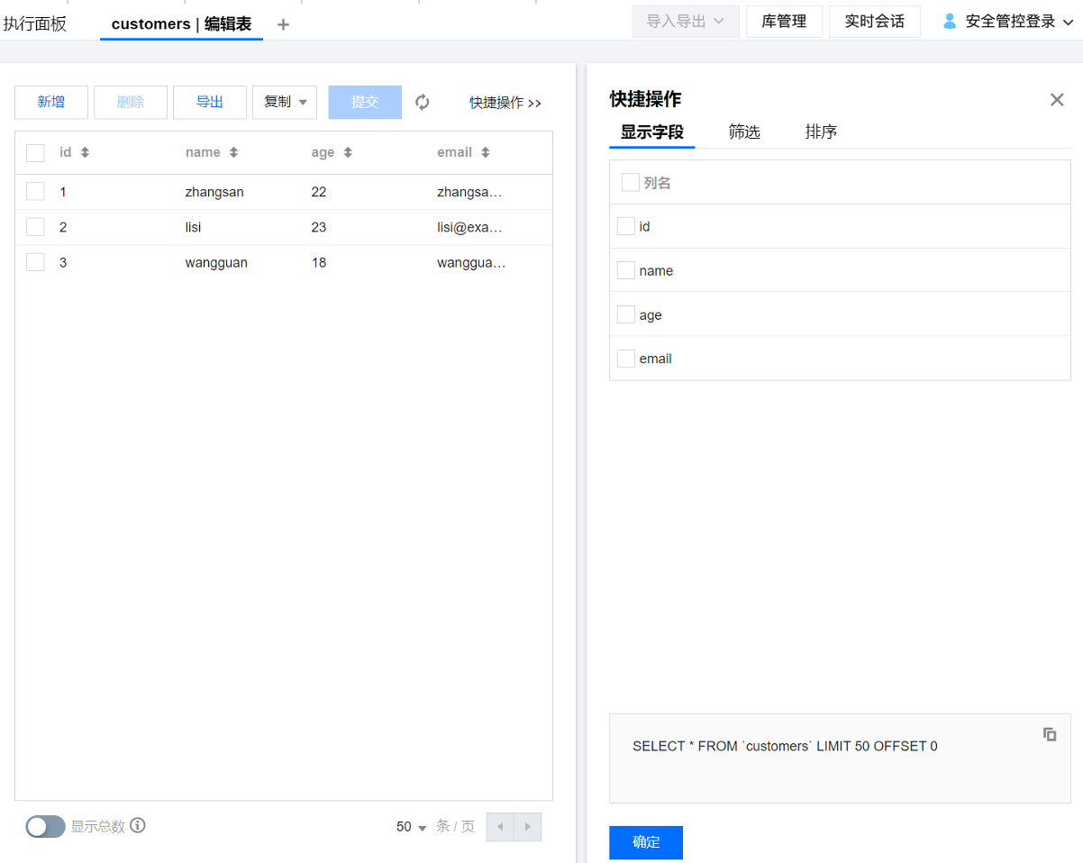 在左侧库表栏,鼠标悬停至表名称处,选择操作 > 打开表,可查看、新增、复制、删除、导出表数据,并支持通过快捷操作选择显示字段、筛选表数据、对表数据排序。