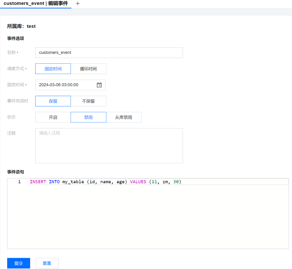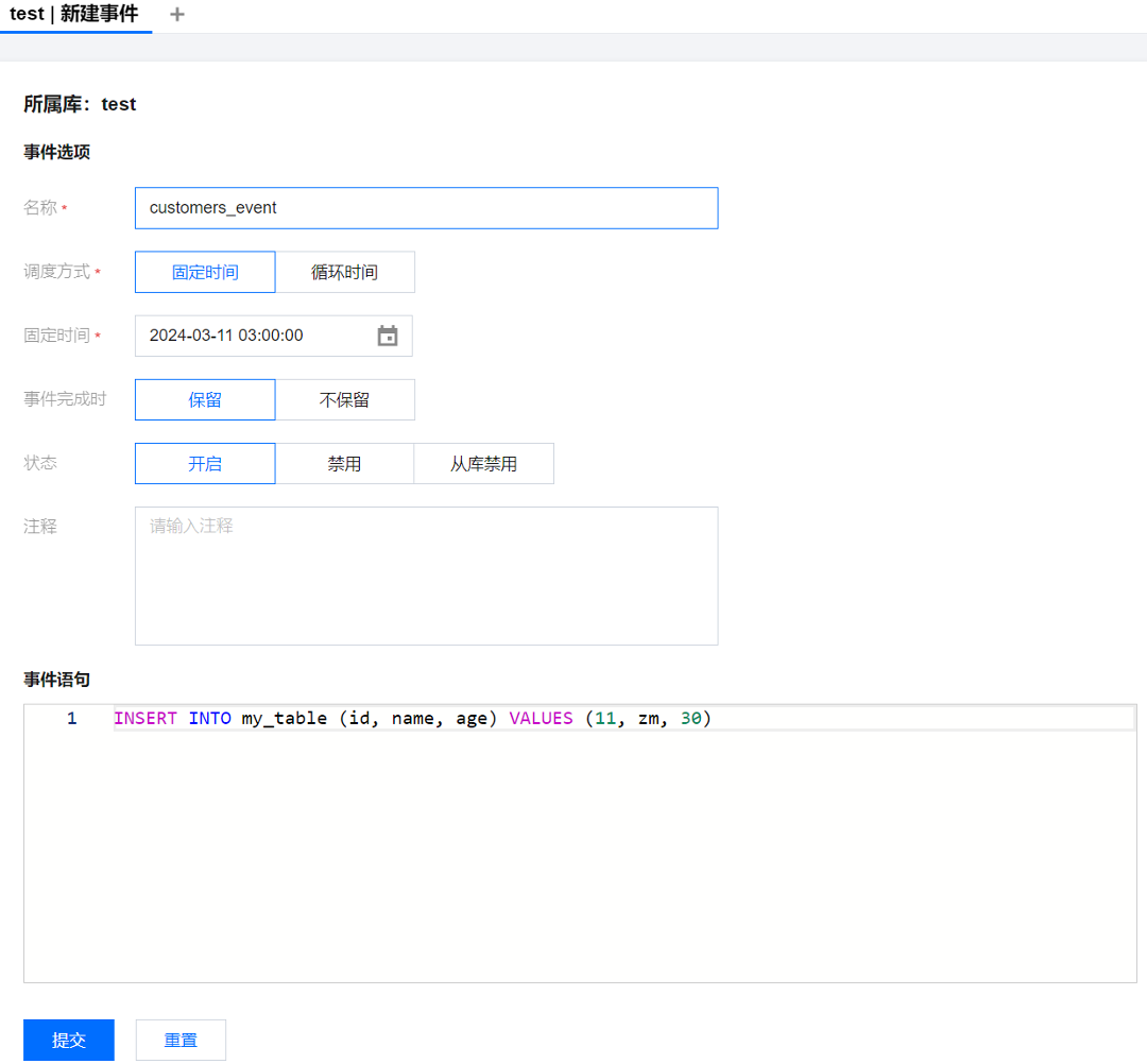2. 在右侧新建事件页面,输入事件名称,选择调度方式、事件完成时是否保留、事件状态,输入事件语句,单击提交。