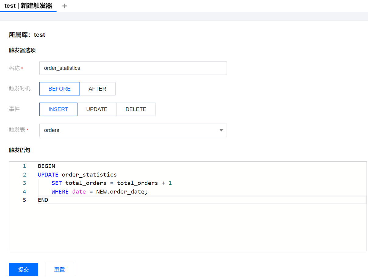 2. 在右侧新建触发器页面,输入触发器名称,选择触发时机、事件、触发表,输入触发语句,单击提交。