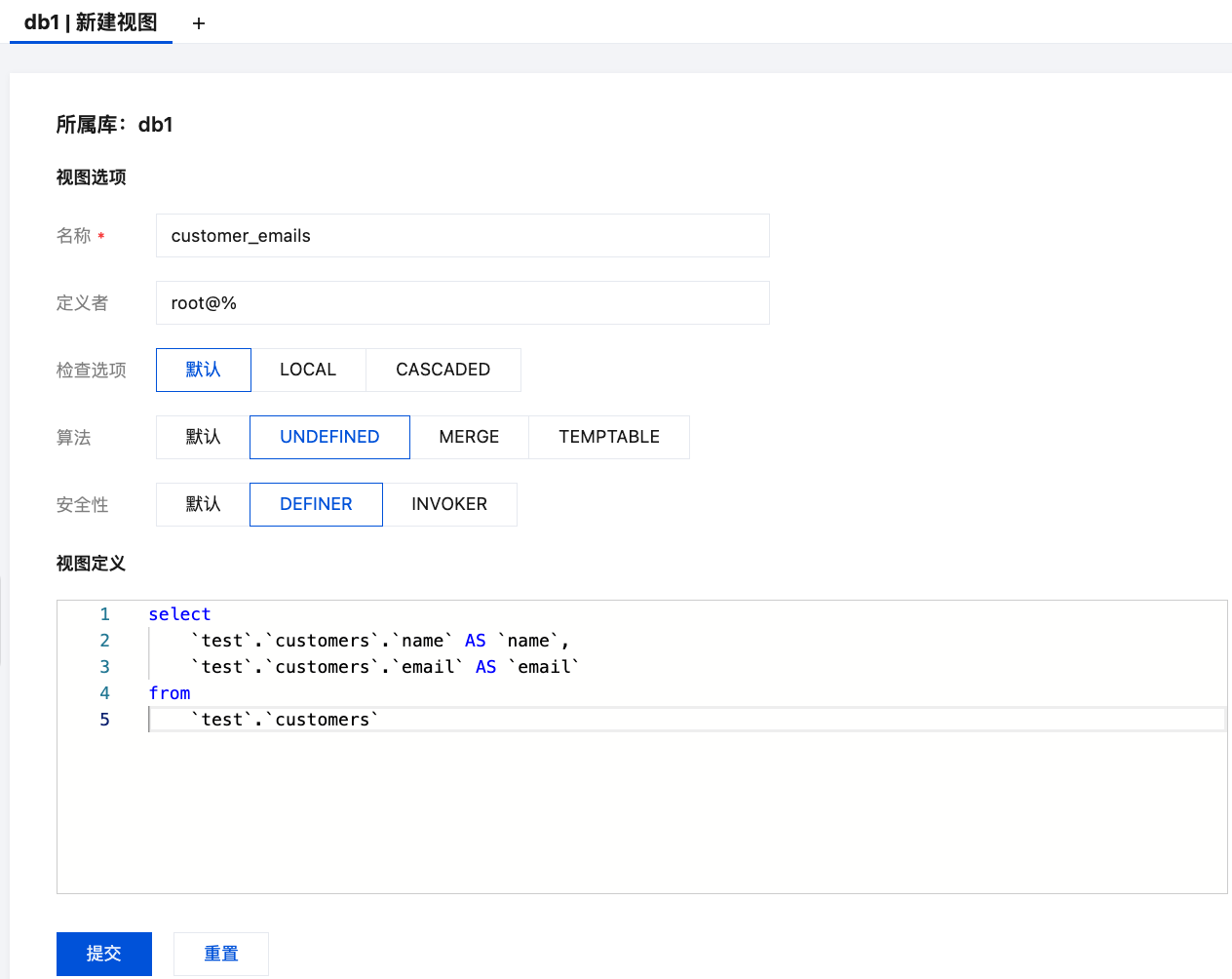 2. 在右侧新建视图页面,输入名称、定义者,选择检查选项、算法和安全性,输入 SQL 语句,单击提交。
