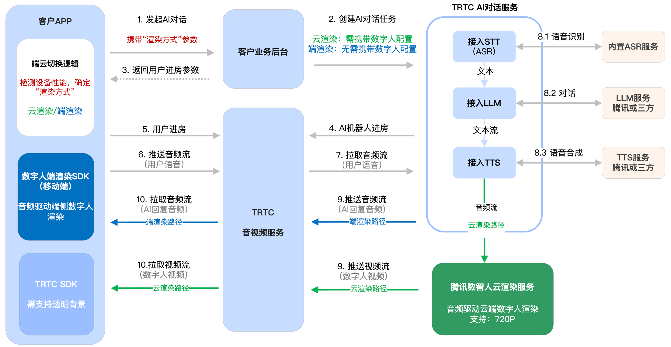 3. 云渲染服务:支持 720P 分辨率的数字人视频输出。