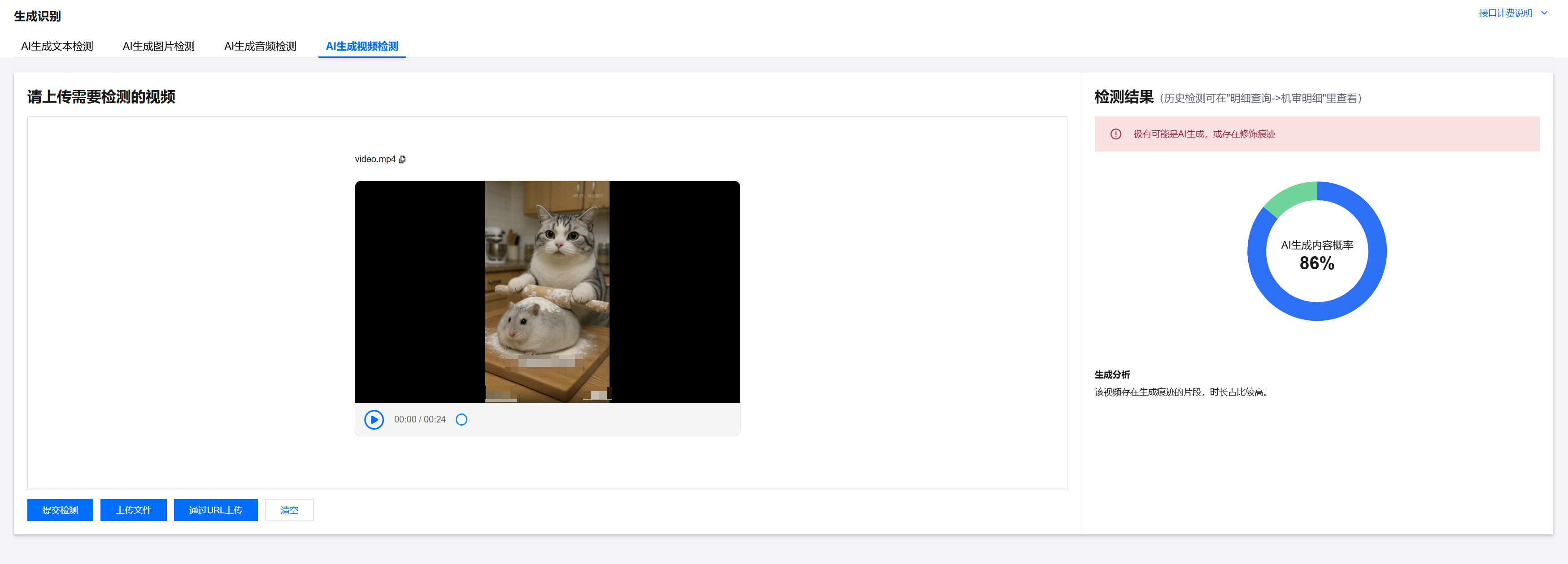 视频 AI 生成识别服务:适用于鉴别视频中的图像内容是否为 AI 工具生成。