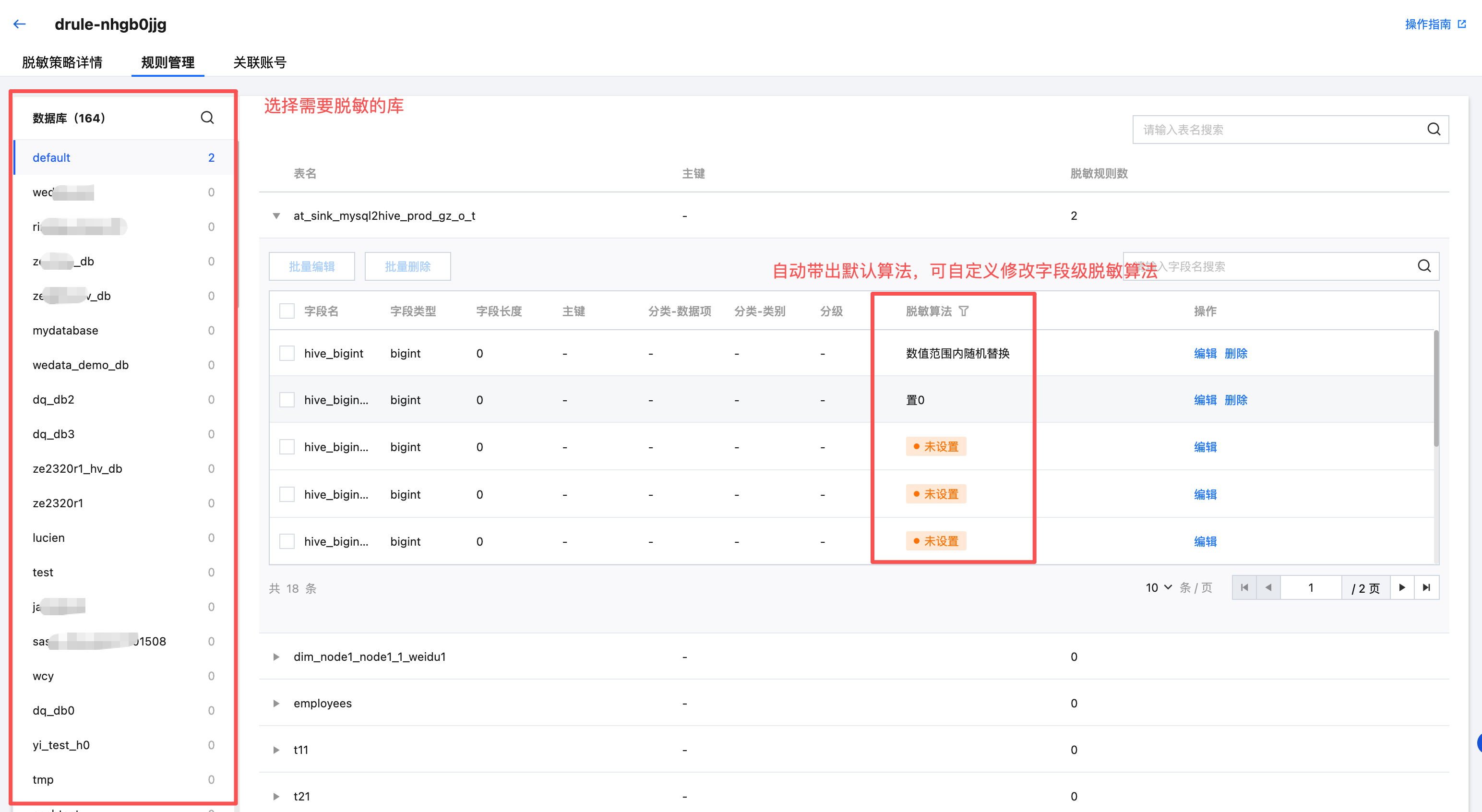 进入规则管理页面,在操作栏管理脱敏算法,您可以编辑和删除当前字段的脱敏算法。