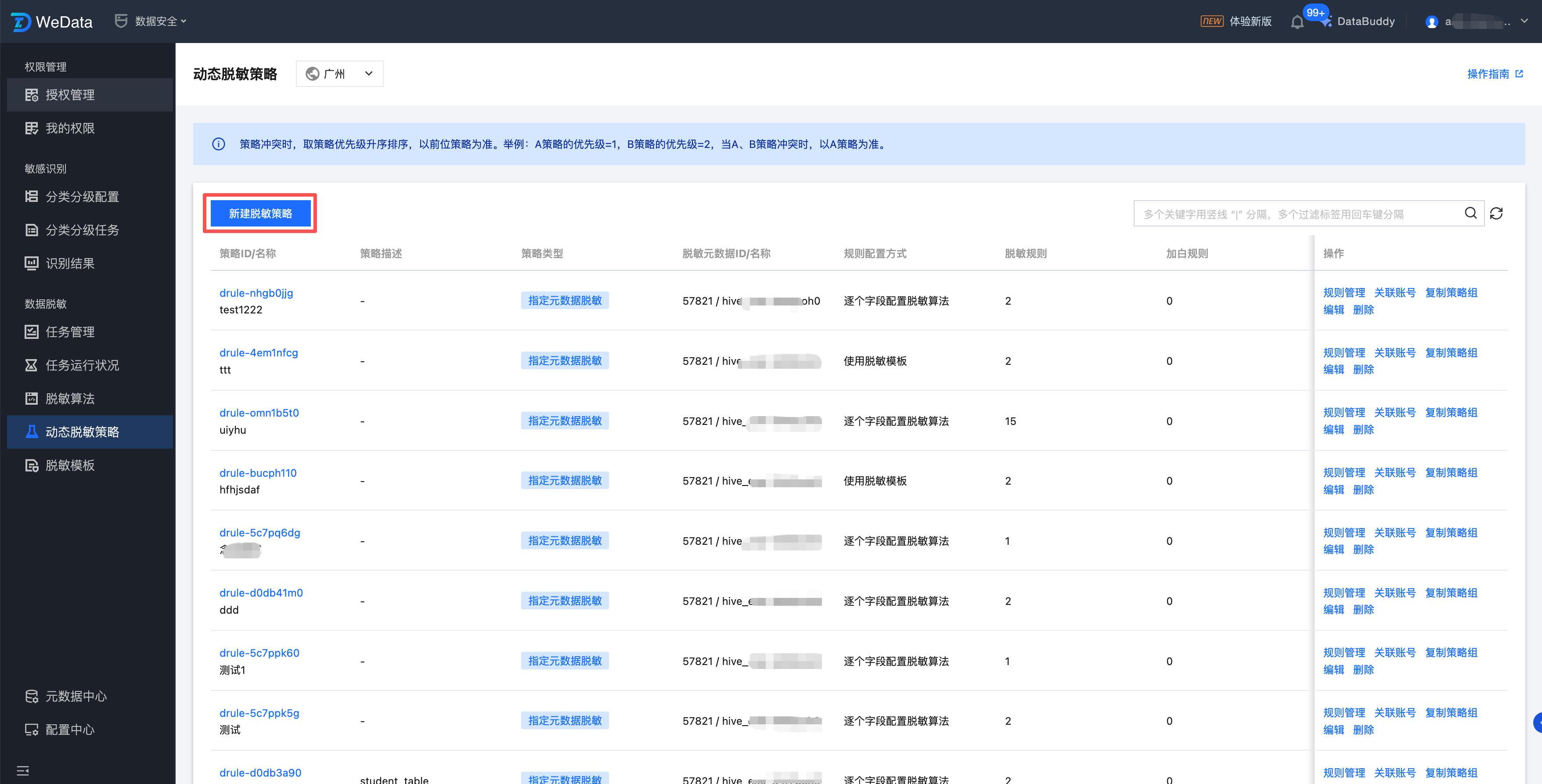 1. 选择数据安全 > 数据脱敏 > 动态脱敏策略,进入脱敏策略页面,单击新建脱敏策略。