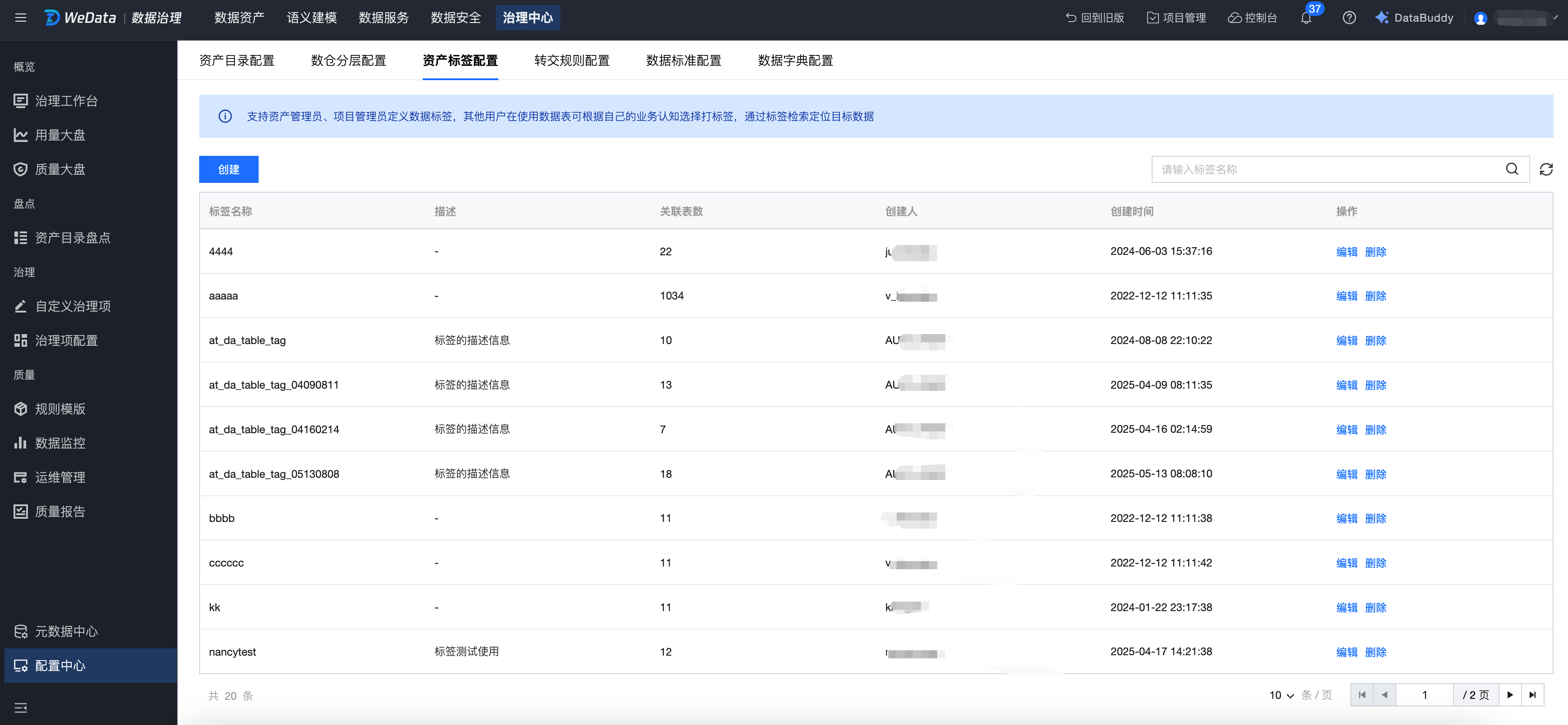 资产标签配置支持资产/项目管理员定义数据标签,其他用户在使用数据表时可根据自己的业务认知选择打标签,通过标签检索定位目标数据。