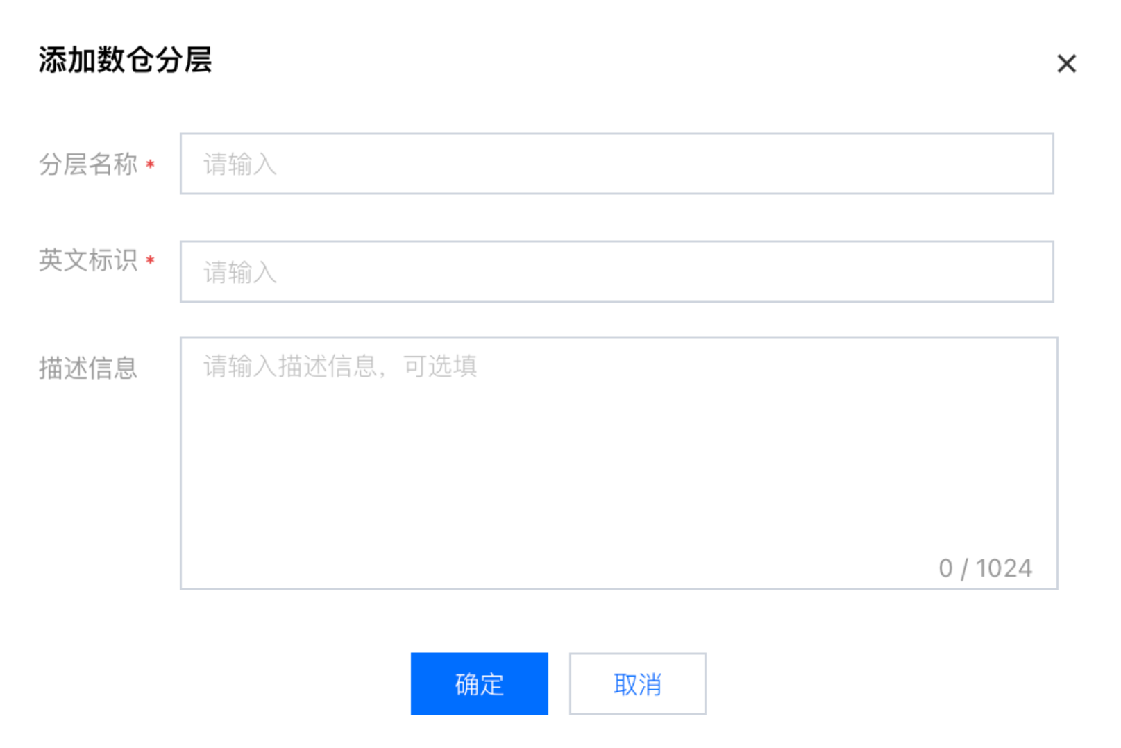 在数仓规划界面,单击添加数仓分层,进入添加数仓分层界面,完成填写相关信息后,单击确定。
