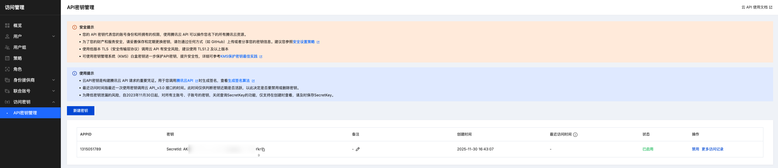 请求头参数 | 注意: 1. 请求头参数中的 TENCENTCLOUD_SECRET_ID和TENCENTCLOUD_SECRET_KEY 分别取自腾讯云 UIN 账号下 API 密钥管理生成的对应的 SecretId 和 SecretKey 信息,参考下图。 ![]() 2. 该 UIN 需开通 WeData 权限,且申请了 MCP 服务需查询的目标范围指标调用权限,即 MCP 服务的指标查询范围,严格限定为该 UIN 已授权调用的指标。 |