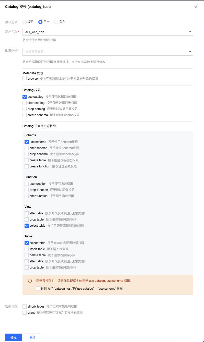 3. 进入授权页面,选择项目或者用户,授予 create catalog 权限: