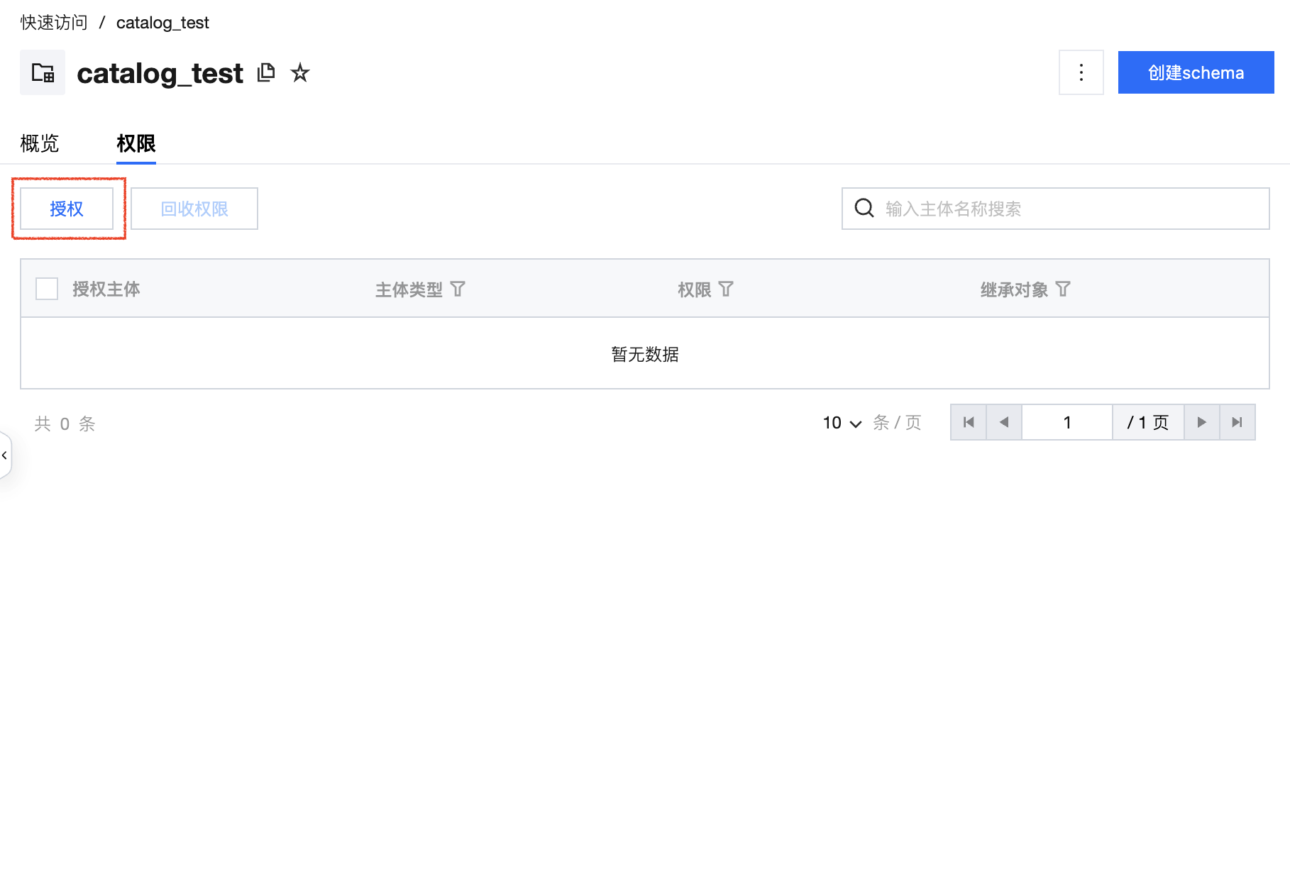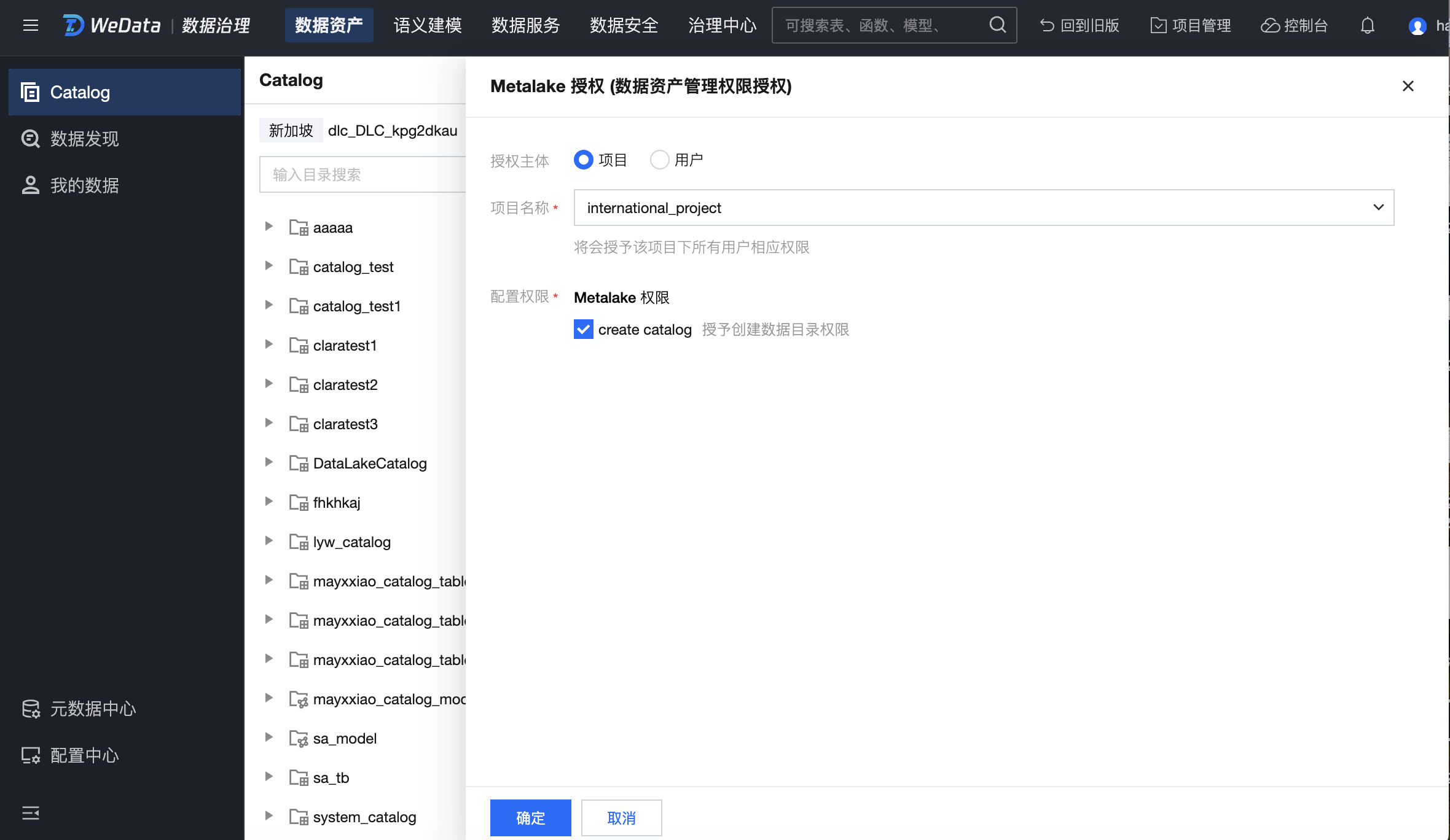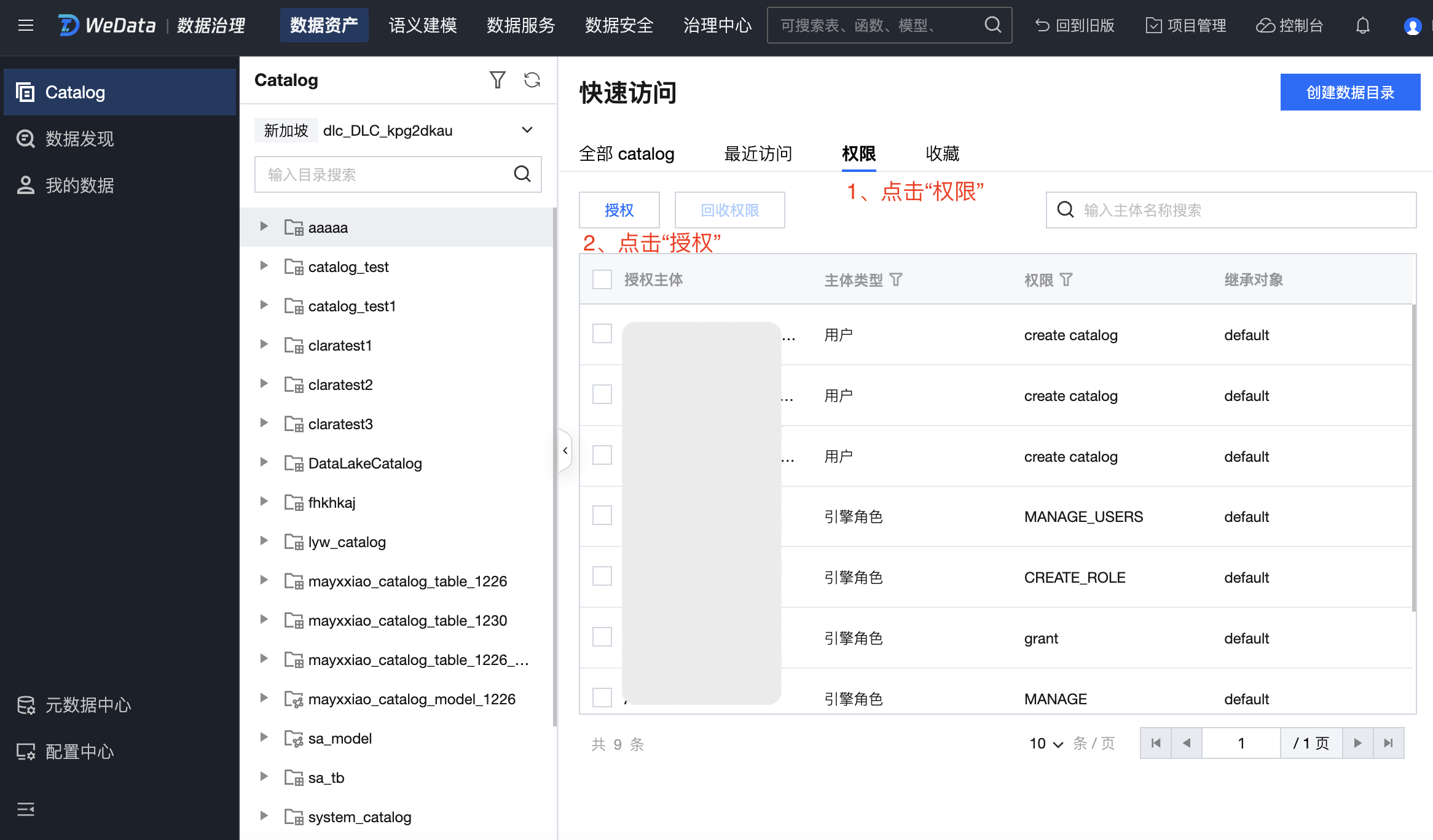 或者在Catalog首页的“权限”tab页,单击授权,给相应的项目成员或者用户授予“创建catalog”权限:
