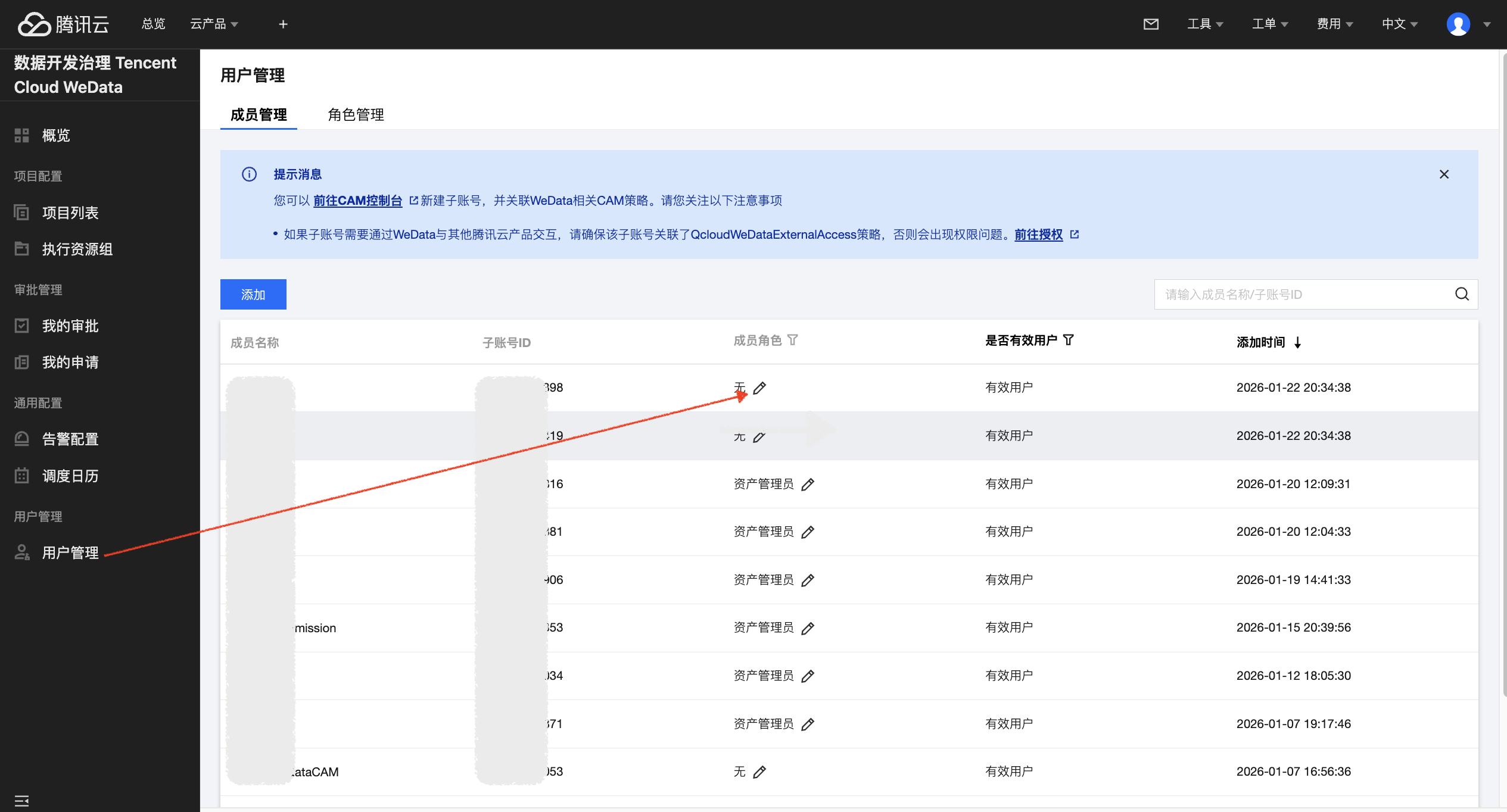 1. 在 WeData 首页,单击左侧用户管理,给相应的用户赋予“资产管理员”角色:
