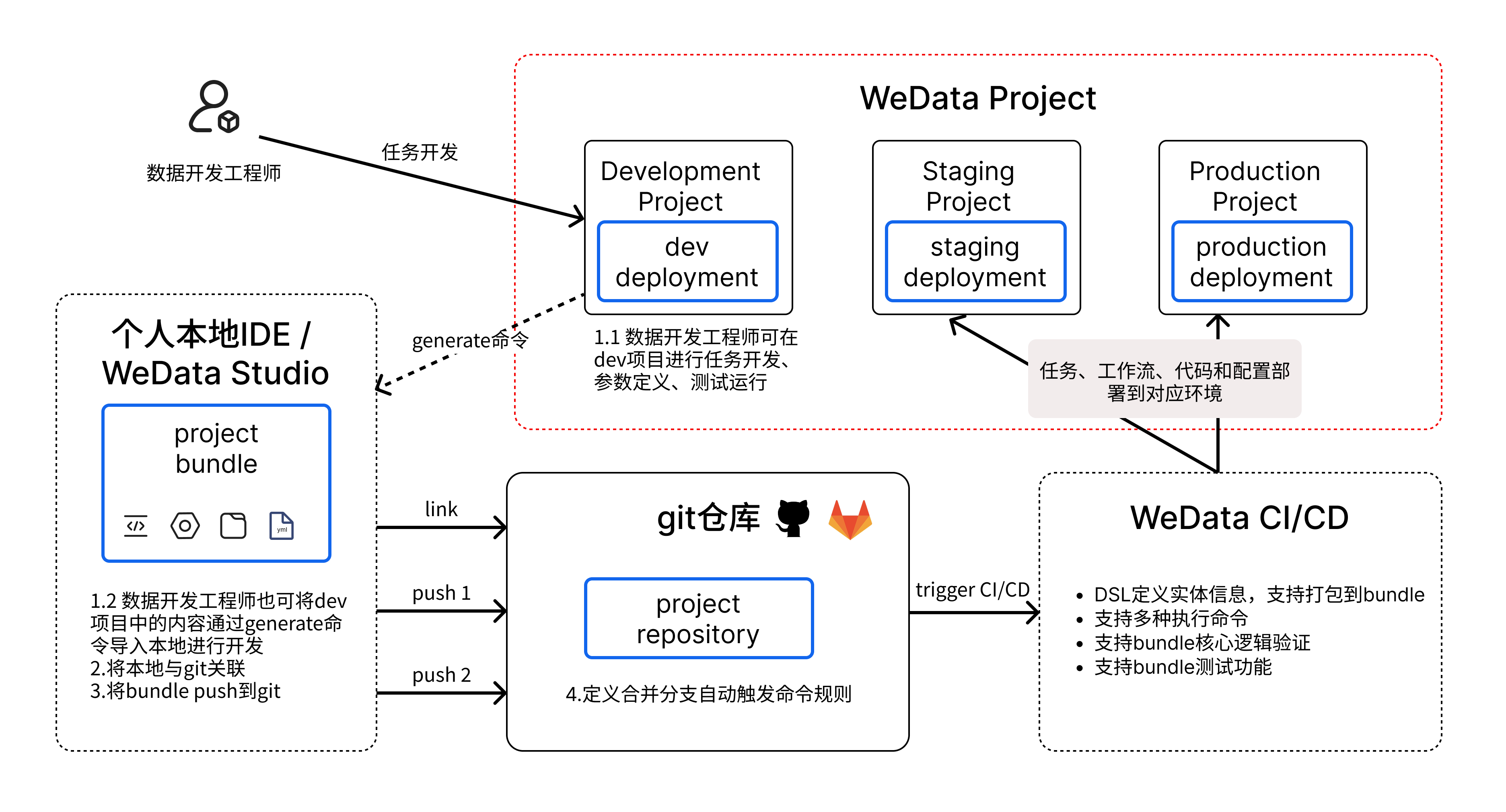 WeData 使用 WeData bundle 功能实现 CI/CD 能力。使用 bundle 将 WeData 上的资源(工作流、任务、资源文件、项目参数、告警规则、事件)描述为源文件,这些文件包可以进行源代码控制,并且您可以使用外部 CI/CD 自动化(例如 GitHub Actions)来触发运行、测试和部署。